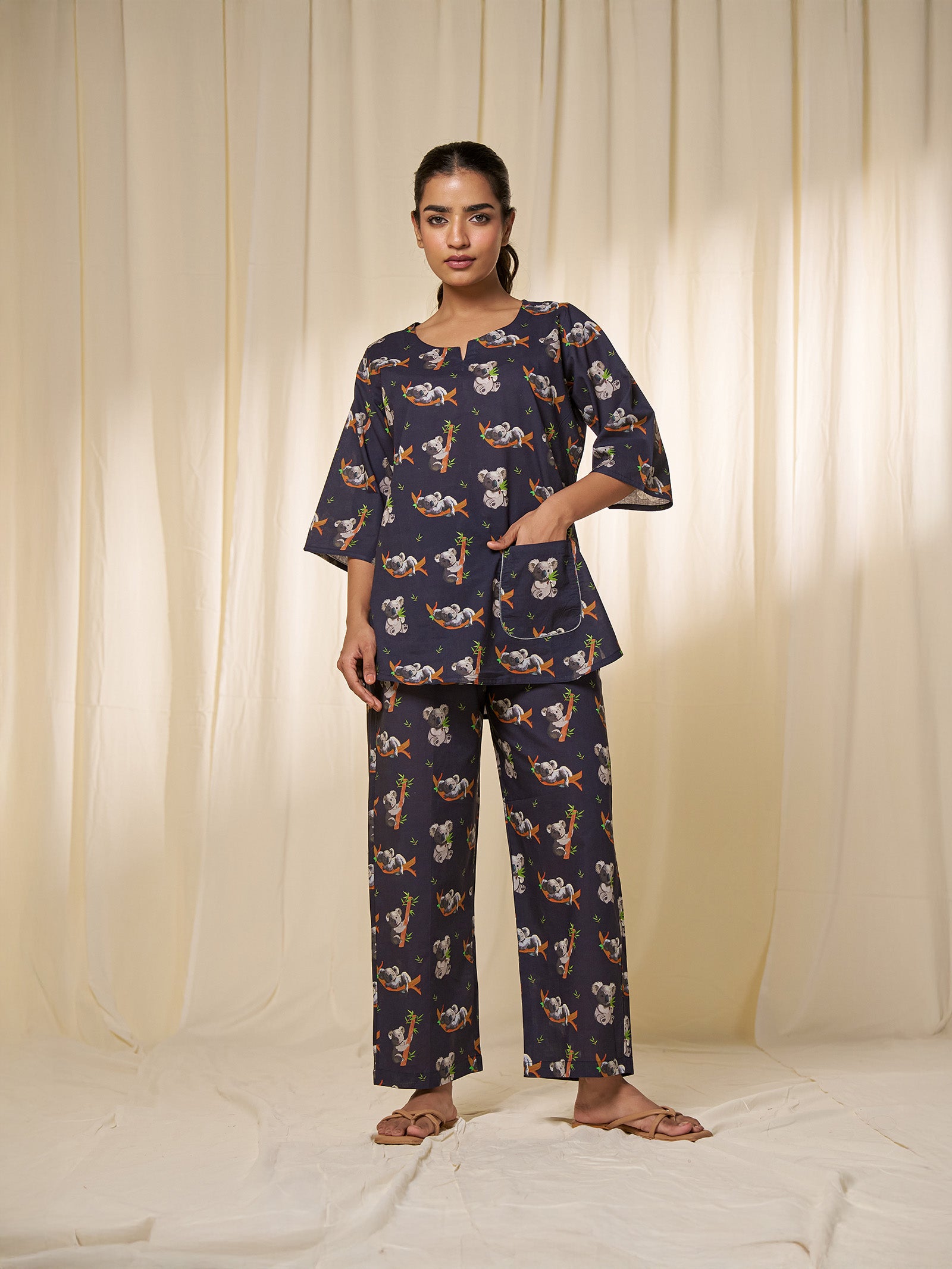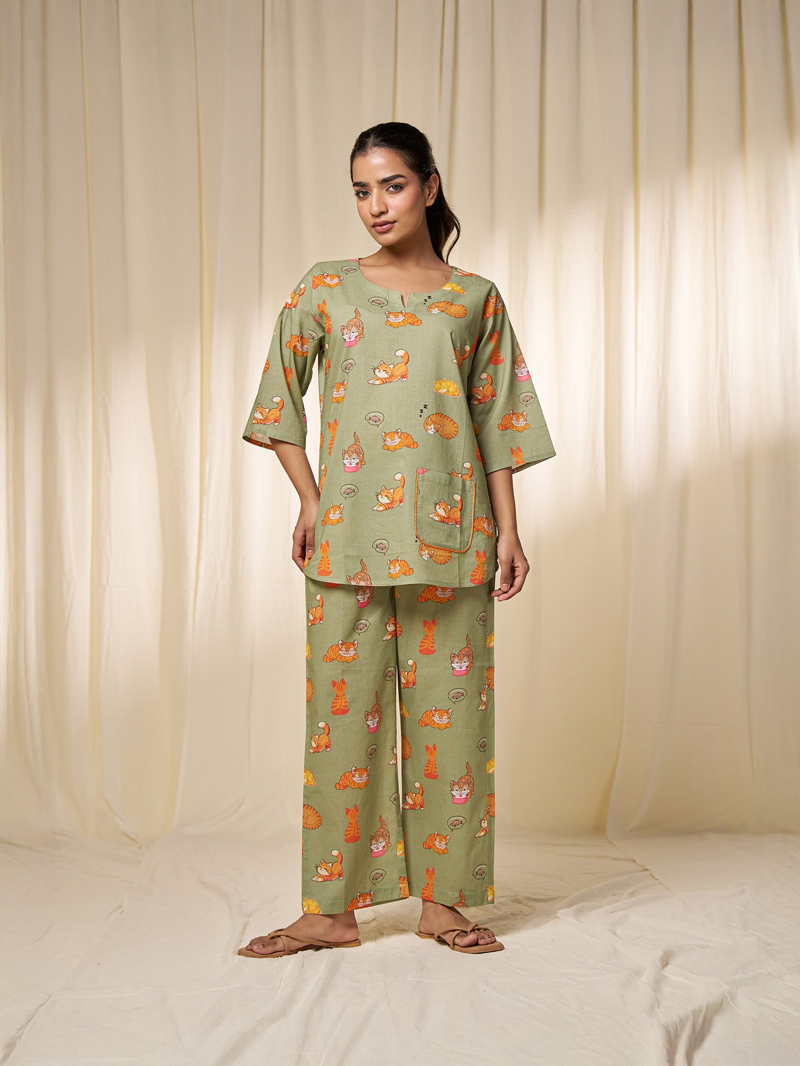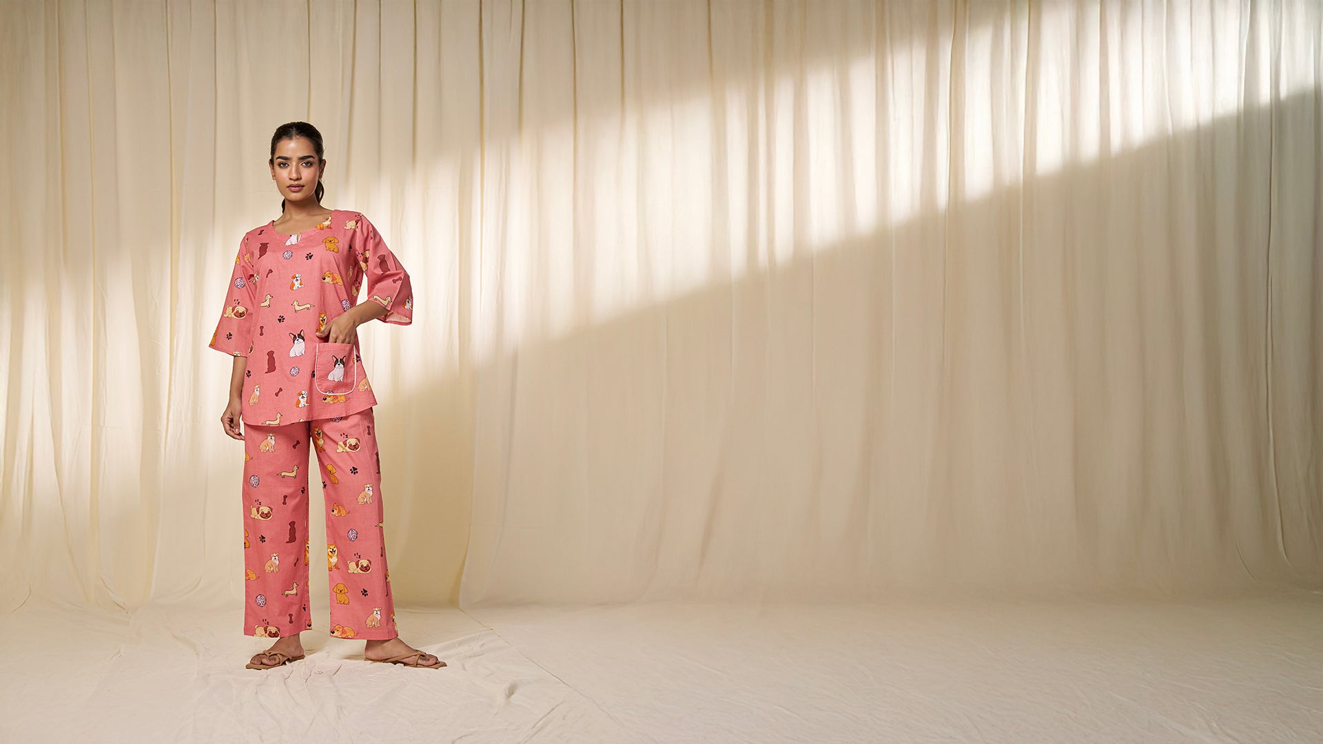 This dark peach night suit set features an adorable dog-themed print with various dog breeds, bones, chew toys, and paws. The top has a split round neckline, a functional front pocket, and three-quarter sleeves. It comes paired with matching pajama pants with two side pockets and a semi-elasticised waistband with drawstring. The set also includes a small pillow adorned with appliques and a matching scrunchie for a coordinated look.