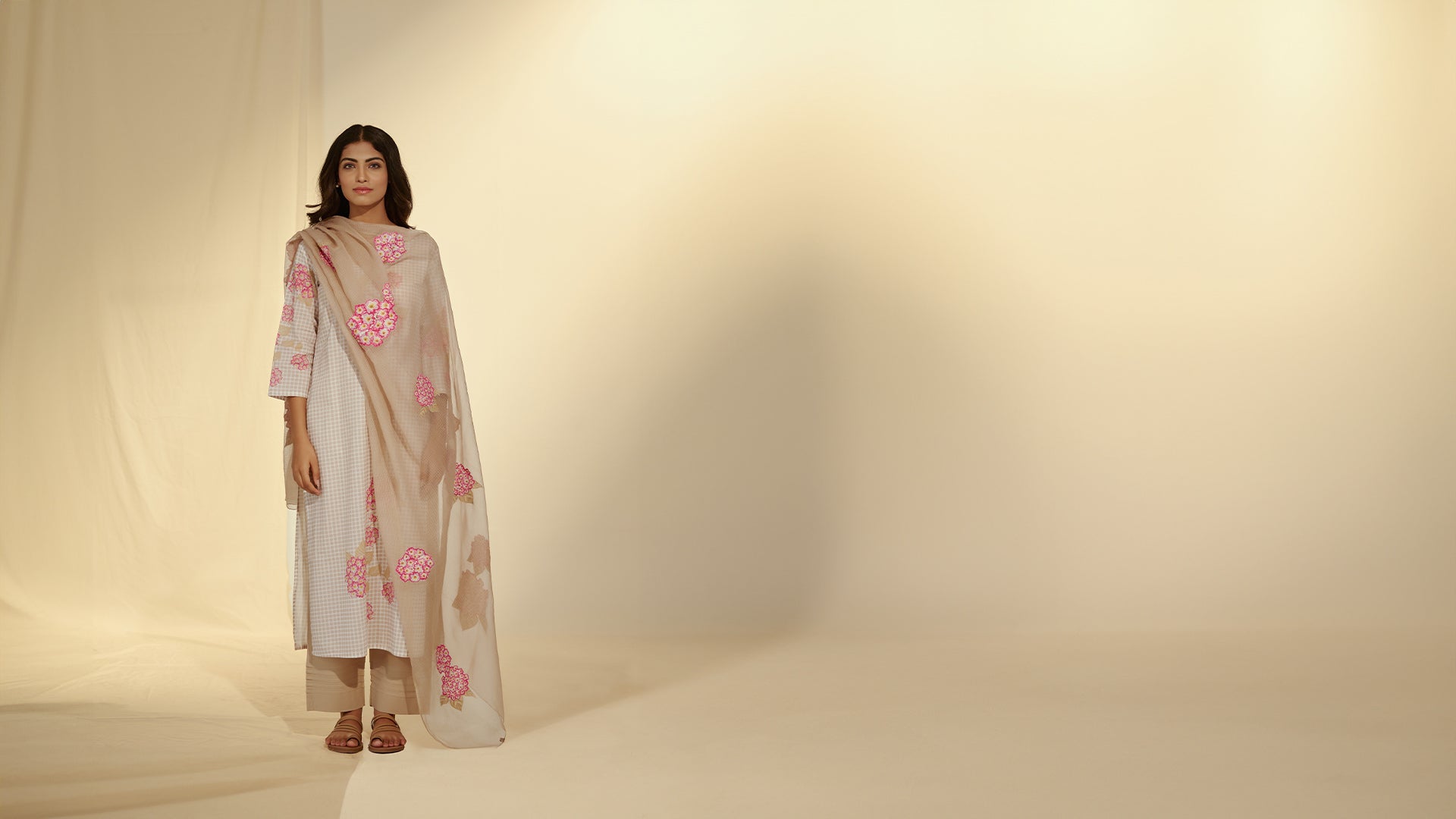This hand-dyed beige Kota Doria dupatta features beautiful appliqués of bunches of pink heliotrope flowers with block-printed leaves, creating a charming and elegant look.