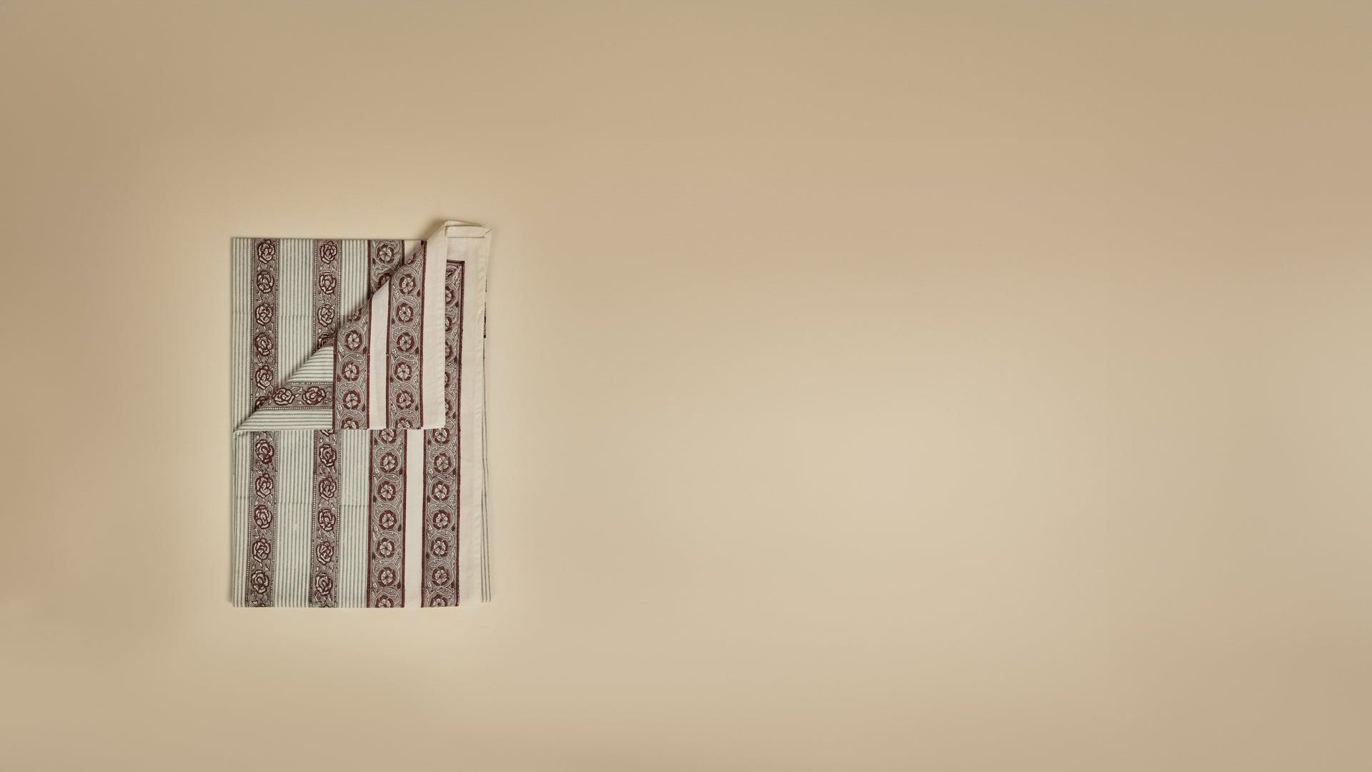 The Dream of Rubies Table Cover features ruby red motifs on a green and white striped background. Hand-block printed on cotton, this cover combines elegance with practicality for everyday use.
