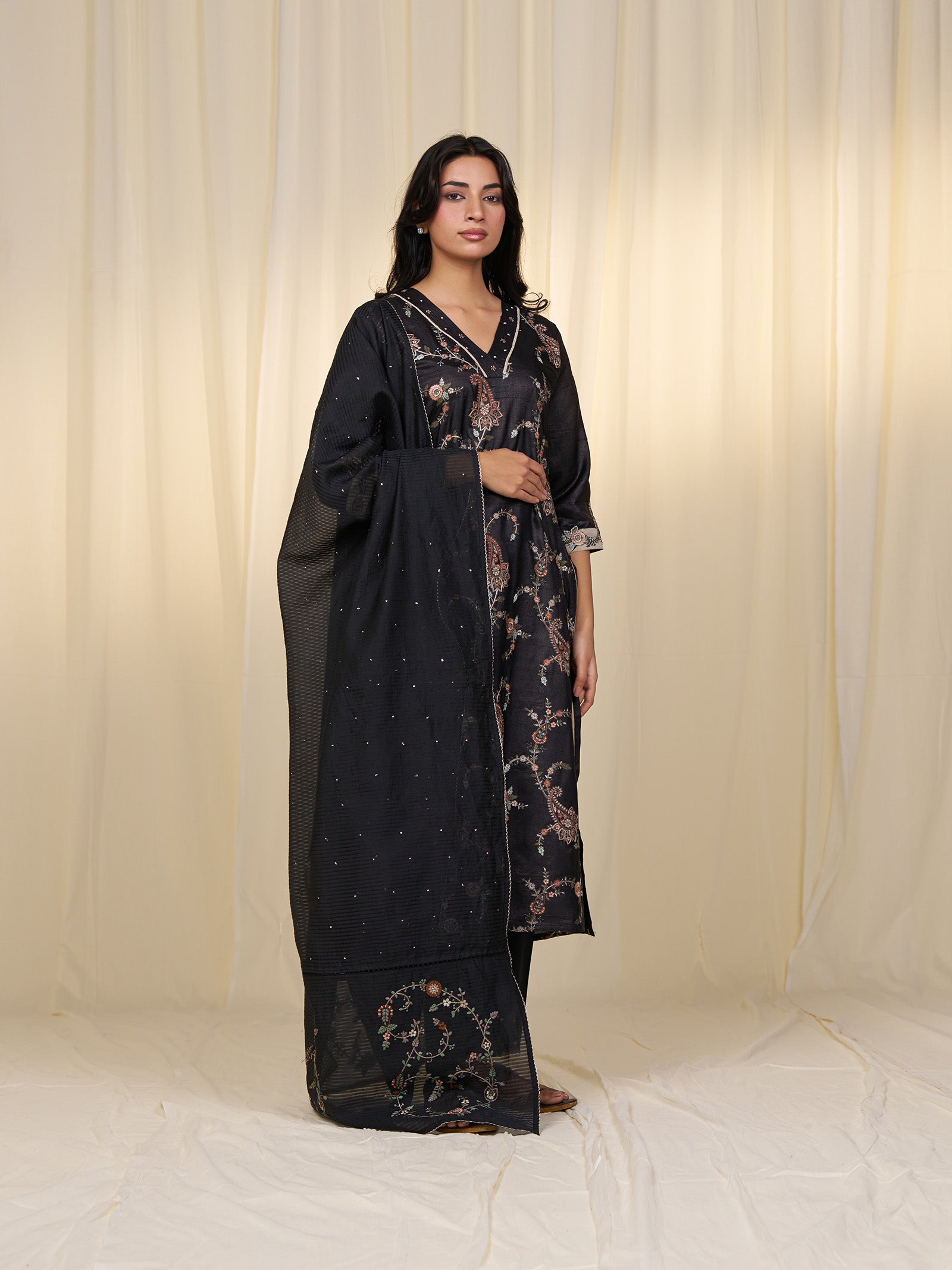 This straight-cut tussar silk kurta in deep charcoal is richly embroidered with floral and paisley motifs in muted beige, rust, and soft green. Its V neckline is enhanced with floral embroidery and finished with beige piping which is echoed along the side slits. Plain black three-fourth sleeves feature floral appliqué and embroidery on the cuffs, which is mirrored on the back yoke. The kurta is lined with voile.