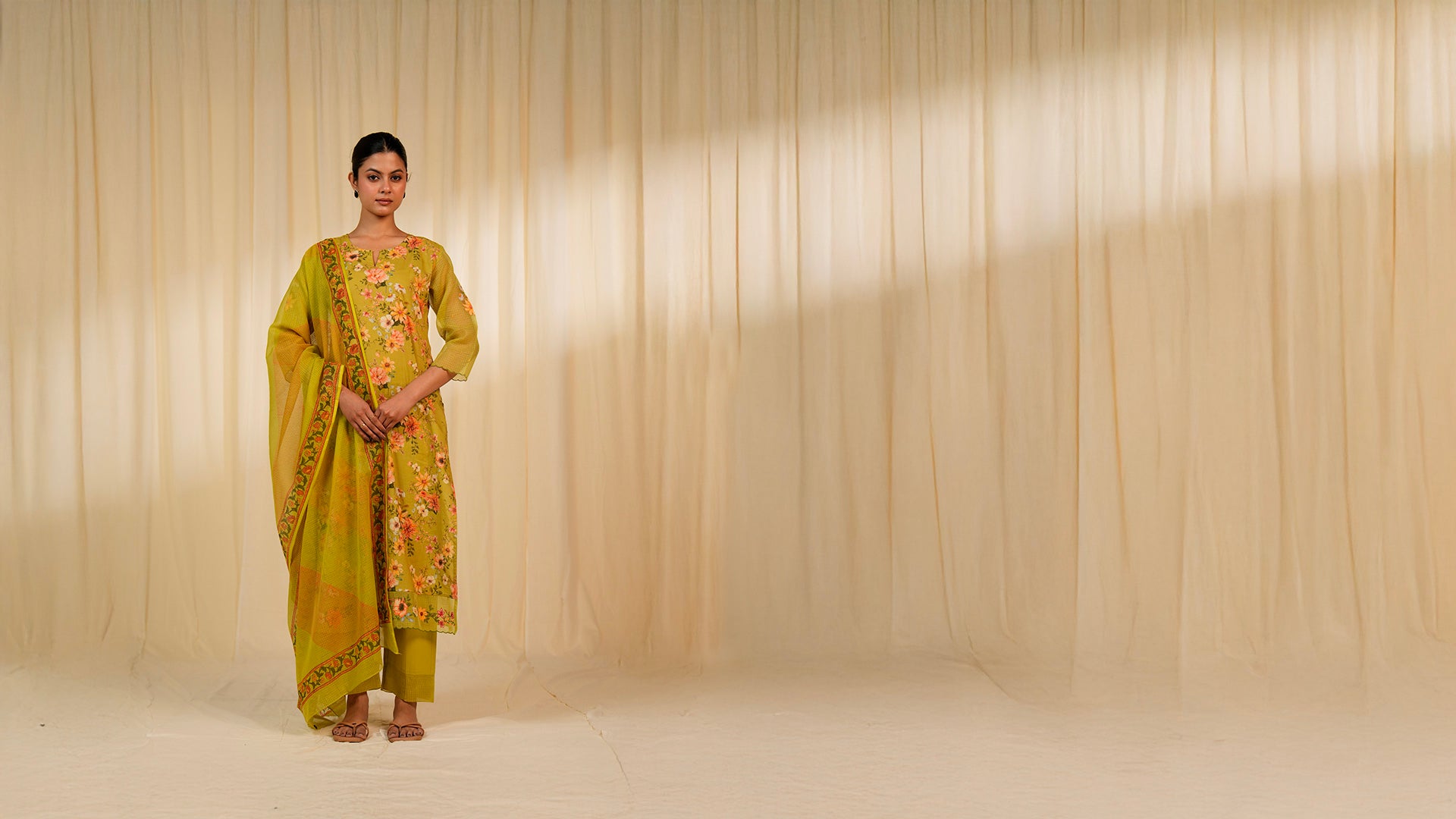 This chartreuse green Kota Doria dupatta features a printed khari border in shades of orange and green. The centre is detailed with alternating hand block prints of delicate stripes in orange tones.