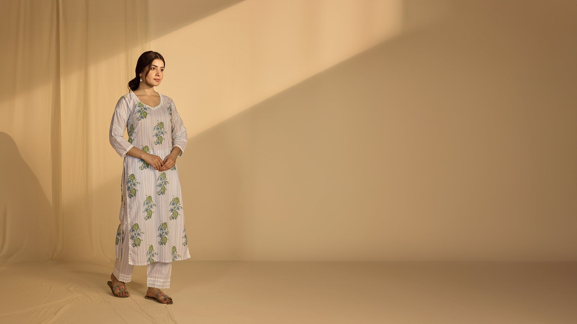 Inspired by the delicate elephant creeper flower, this cotton kurta showcases hand-block printed stripes with floral motifs, evoking the look of flowers climbing a trellis. Cascading vines and lush foliage add to its charm, while lace Embellishment on the sleeves and edges enhances the design. Silver sequins embellish the front flowers, adding a subtle sparkle.