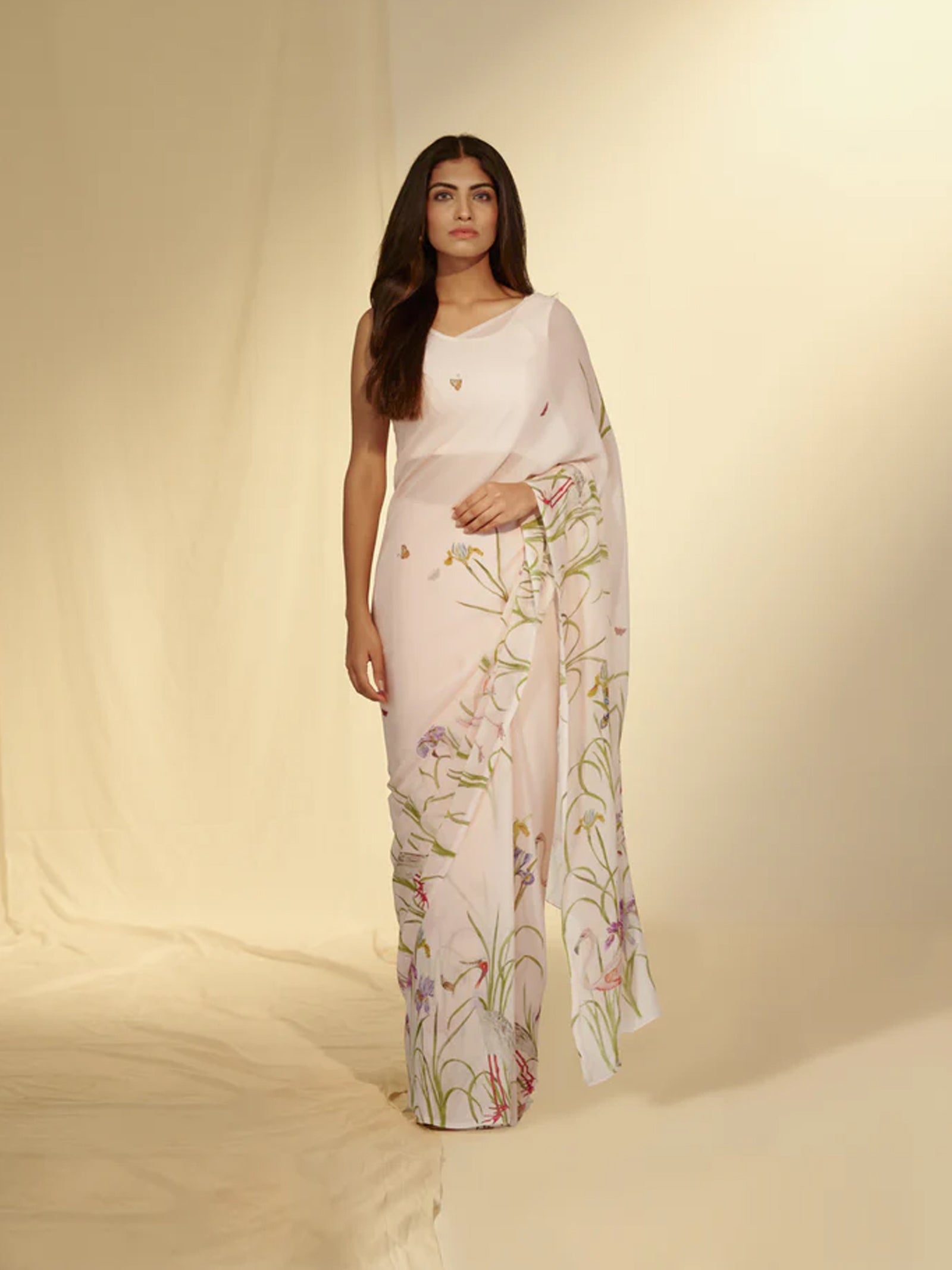 This ethereal chiffon saree features a dreamy digital print of flamingos and date palms, creating a serene, tropical vibe. The light, flowing fabric is perfect for elevating your style, while the delicate details add a soft, feminine touch to your look. This saree comes with a matching bamboo silk blouse piece for a complete ensemble.
