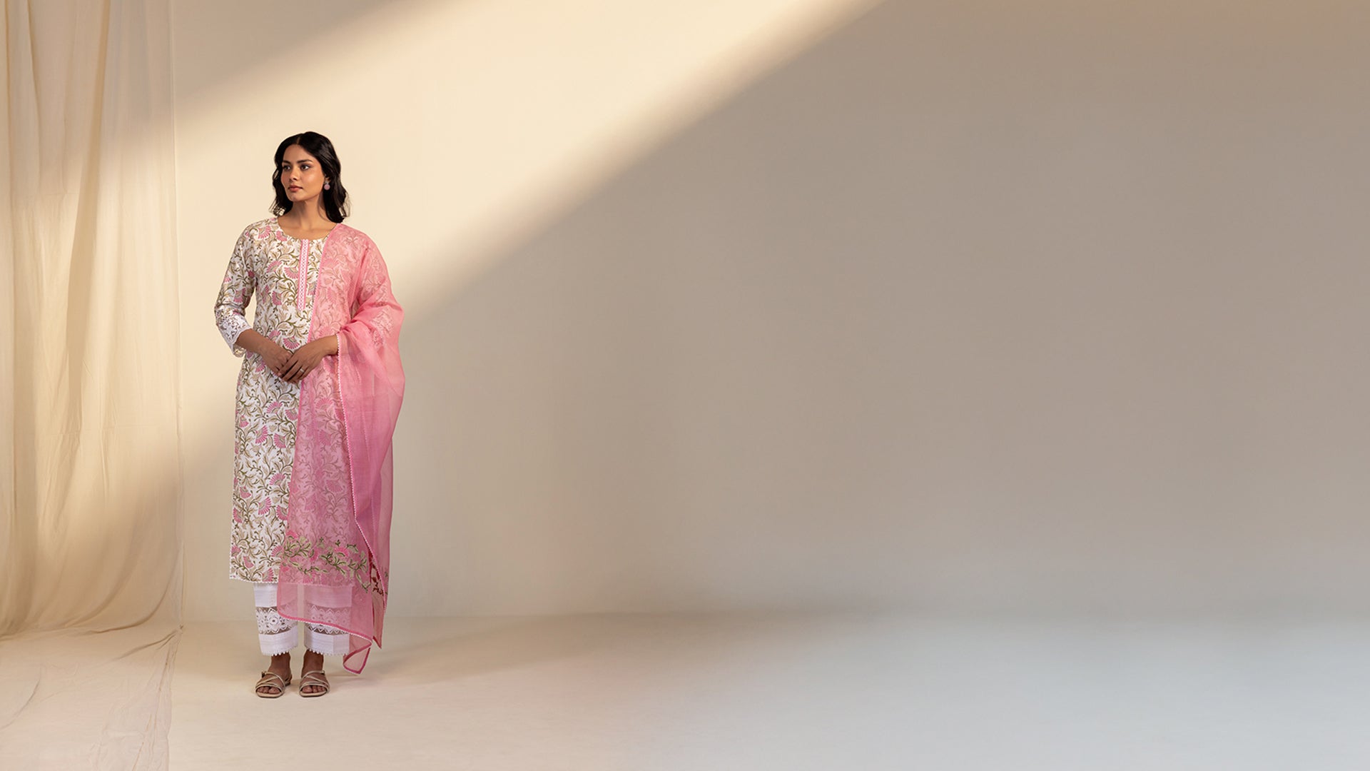 This hand-printed cotton kurta in vibrant pink and leaf green features intricate embroidered lace detailing at the sleeve cuffs, enhancing its elegance. A straight-cut design with three-fourth sleeves, it is further adorned with lattice crochet lace on the front yoke and sleeve cuffs, while scalloped lace adds a graceful touch to the flare.