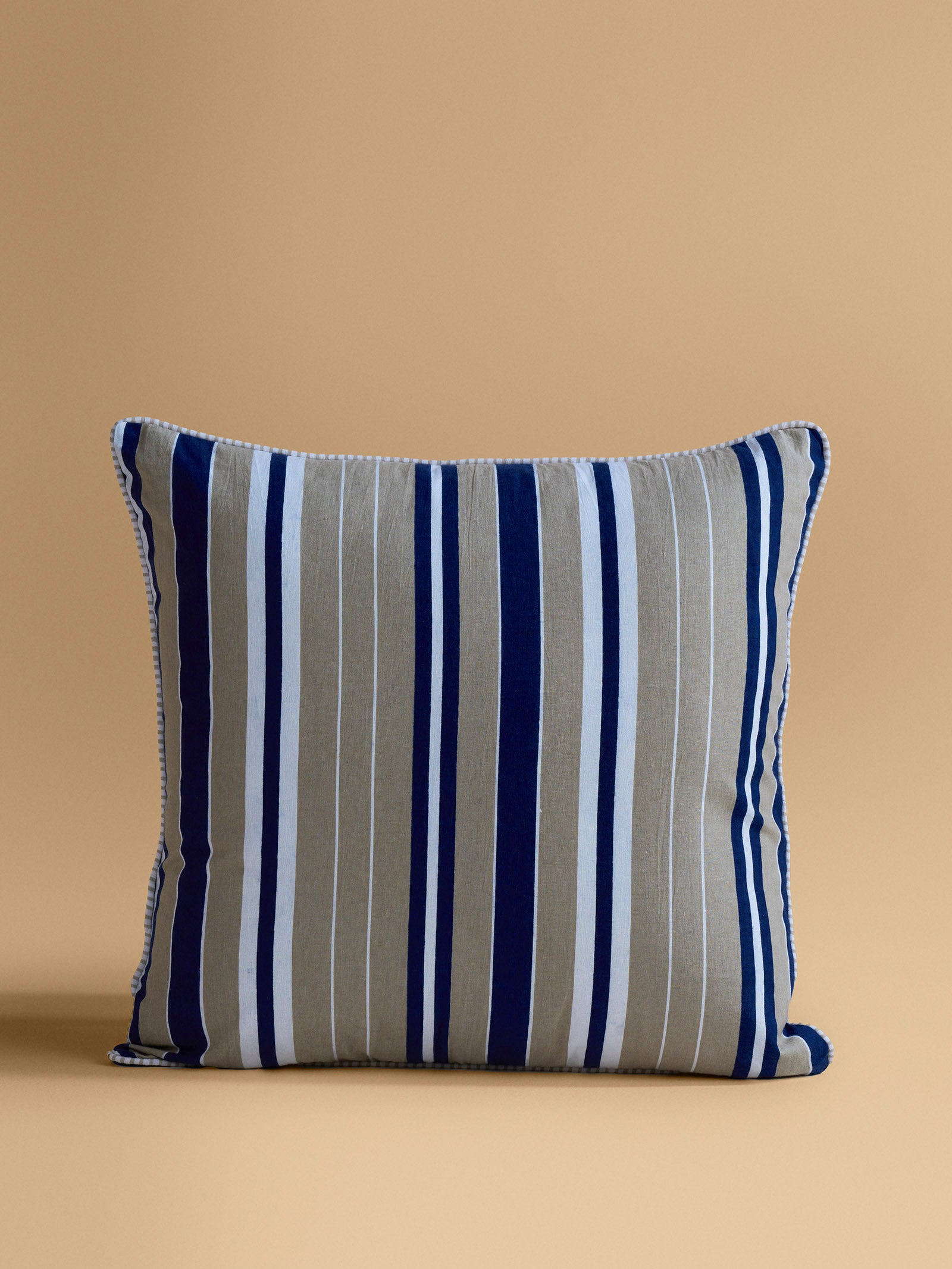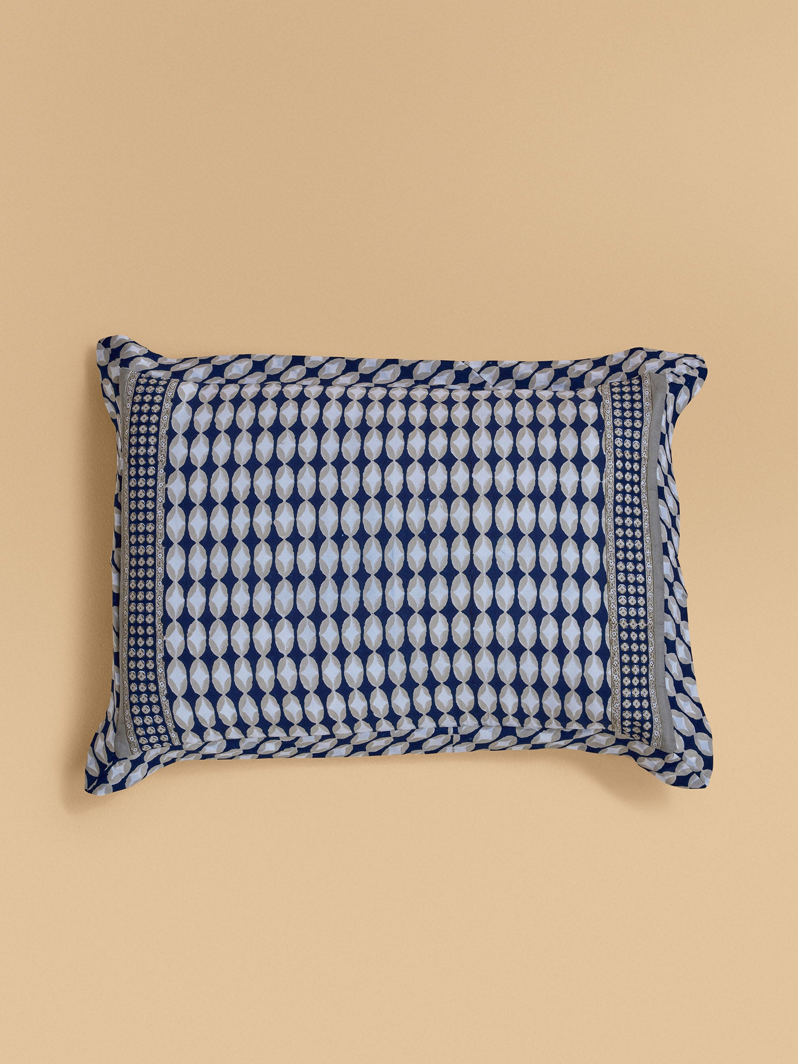 Inspired by Mughal design, this royal blue bedcover showcases rows of almond-shaped buta motifs filled with intricate floral detailing in stone grey and fine brown outlines. Small floral clusters add balance and rhythm. A striped and geometric border frames the central print beautifully. Available in two sizes, it brings timeless elegance to any bedroom.