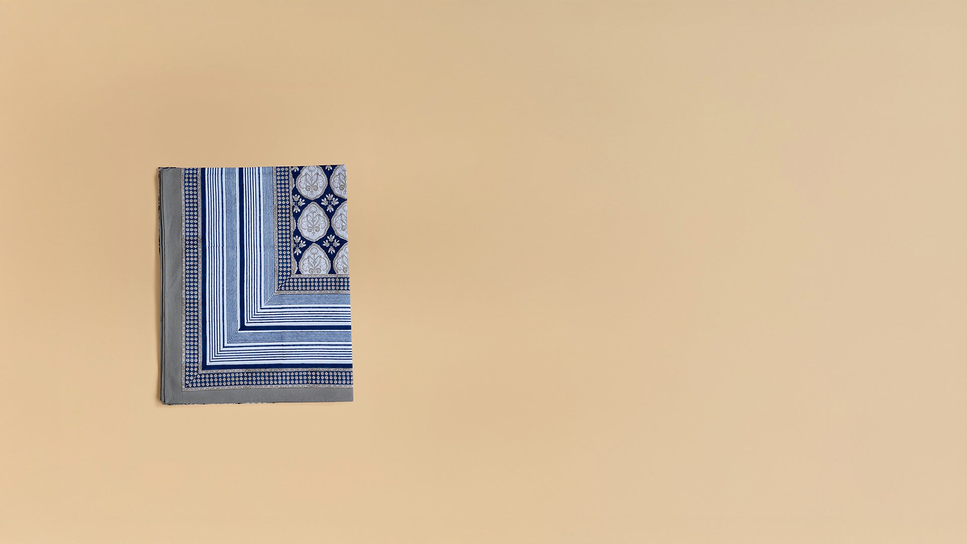 Inspired by Mughal design, this royal blue table cover showcases rows of almond-shaped buta motifs filled with intricate floral detailing in stone grey and fine brown outlines. Small floral clusters add balance and rhythm. A striped and geometric border frames the central print beautifully. Available in two sizes, it brings timeless elegance to any dining room.