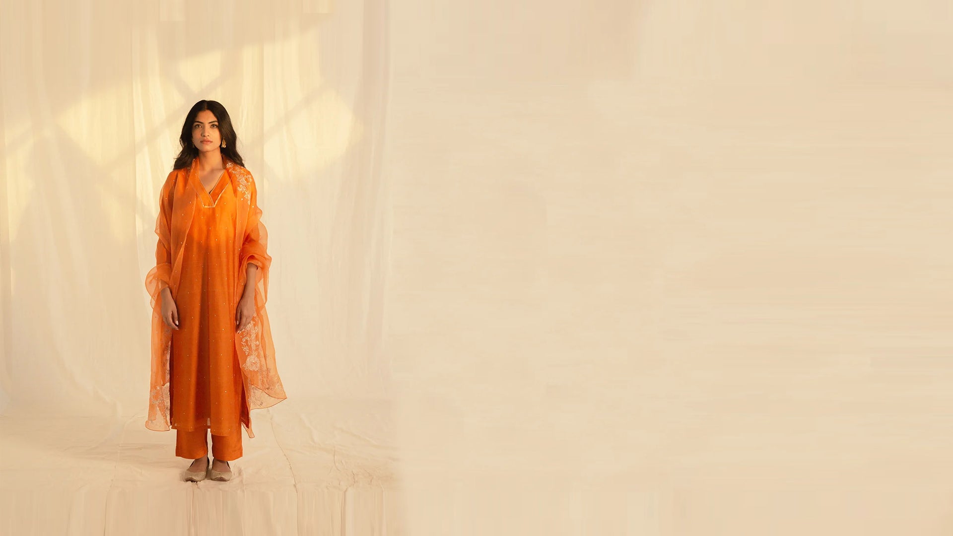 This exuberant Chanderi kurta in a rich burnt orange hue is adorned with dainty golden sequins, exuding festive elegance. Framed with matte gold tissue at the neckline and sleeve cuffs, it features a straight-cut design, 3/4th sleeves, and a voile lining, making it a must-have addition to your festive wardrobe.