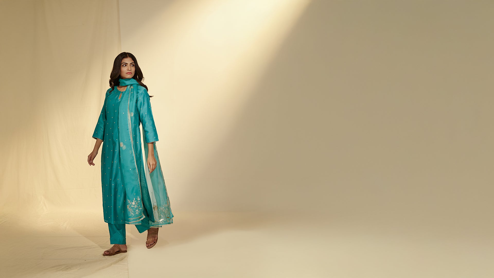 This festive chanderi kurta is adorned with shimmering golden sequins and finished with scalloped golden lace on the neckline and sleeve ends. Featuring a designer round neckline with a handcrafted button, it comes in a straight fit with 3/4th sleeves.