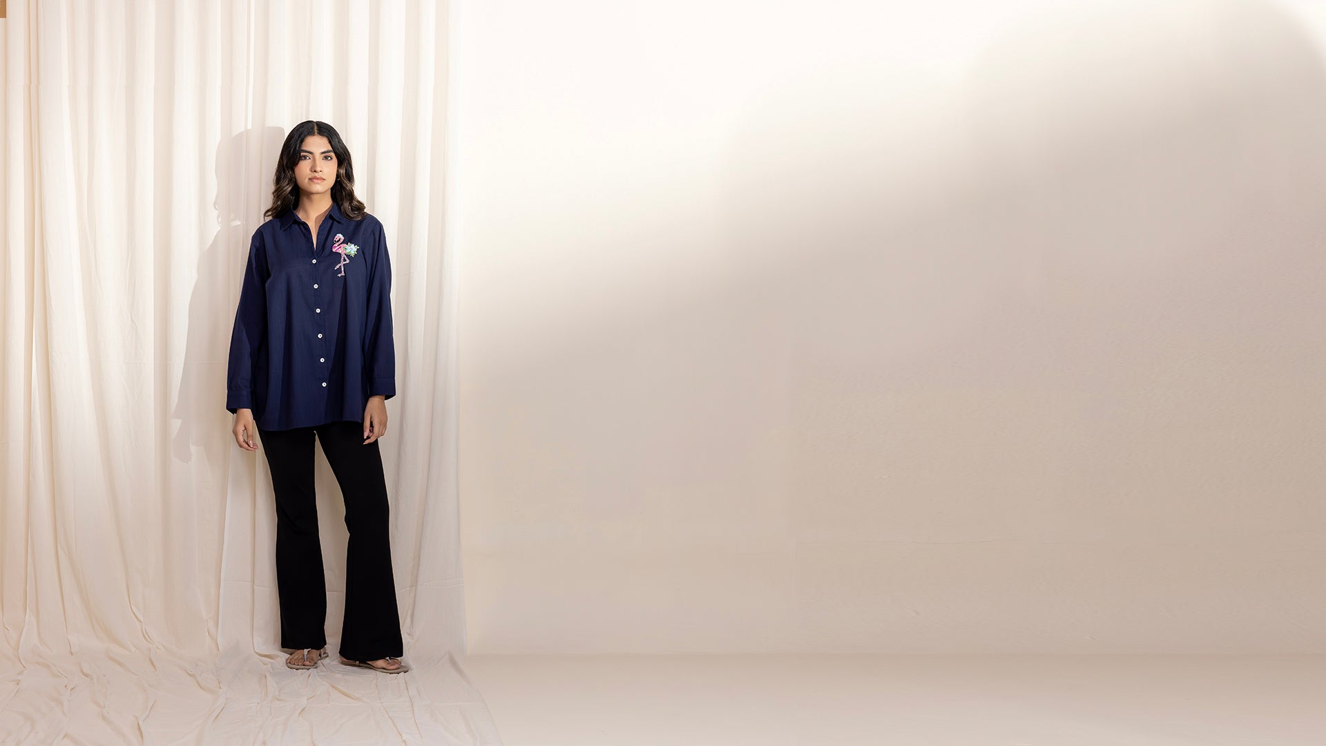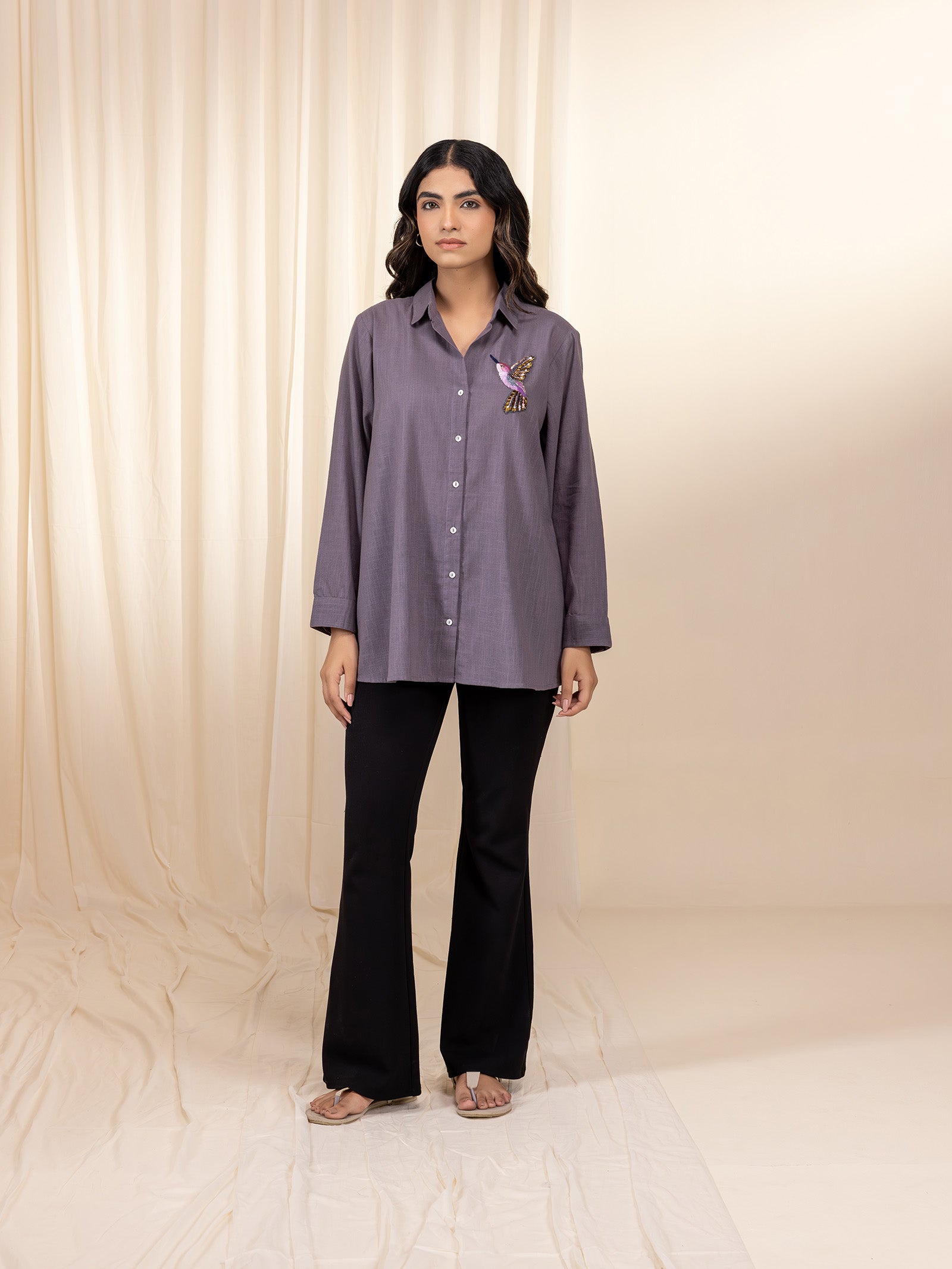 This relaxed-fit navy blue cotton slub shirt features a handcrafted flamingo applique on the front, embellished with colorful sequins in pink, peach, blue, and green. Its button down front opening and sleeve hems have shell buttons, while the back features subtle gathers.