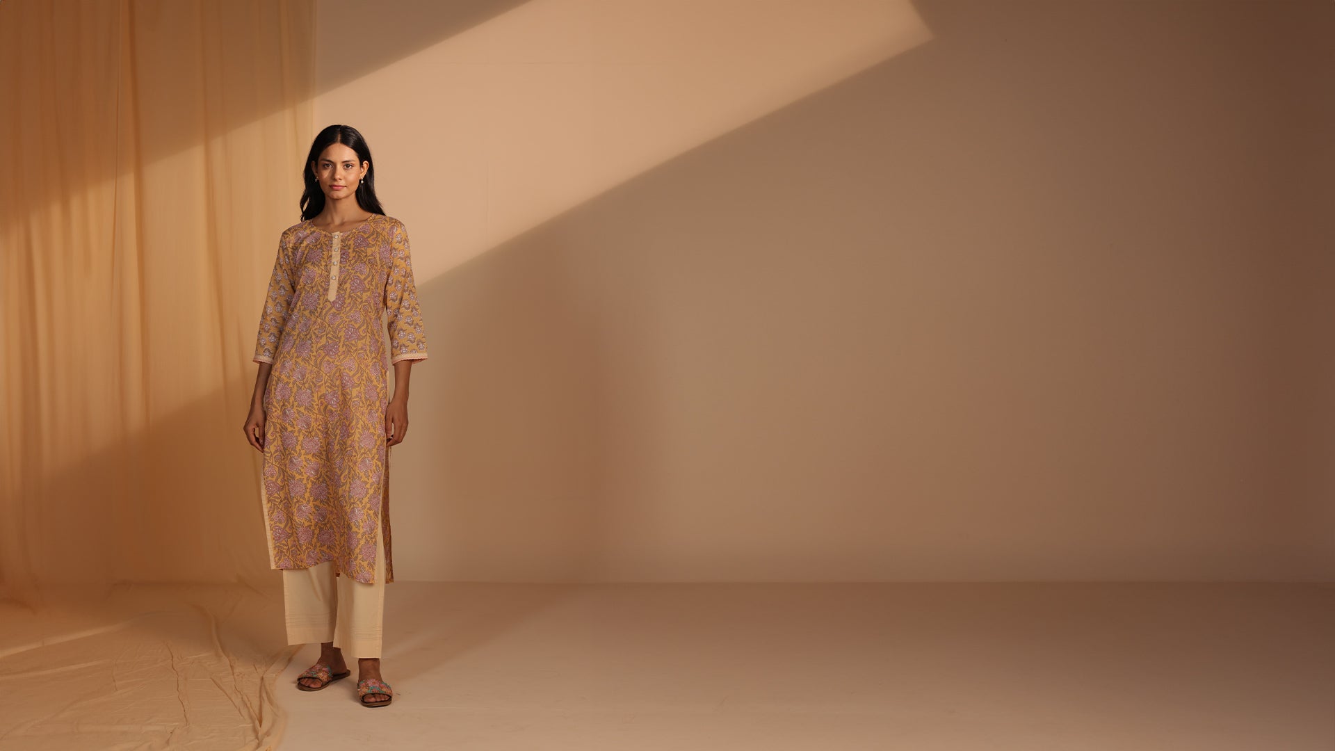 This visually engaging kurta balances bold and subtle floral prints with a Hand-Block Printed design. Adorned with dainty peach lace, white thread embroidery at the sleeve cuffs, and unique button details at the placket, it exudes elegance and charm.