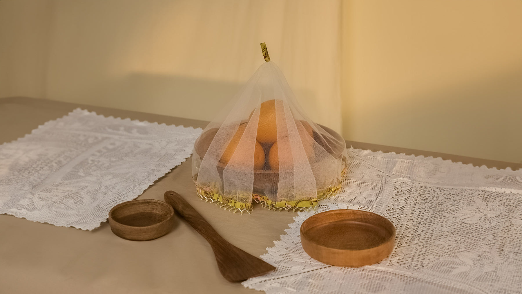 This elegant fruit cover features a delicate net fabric bordered with colourful printed fabric, adorned with intricate beading. The light and airy cover is perfect for keeping your fruits and veggies protected while adding a touch of charm to your table setting.