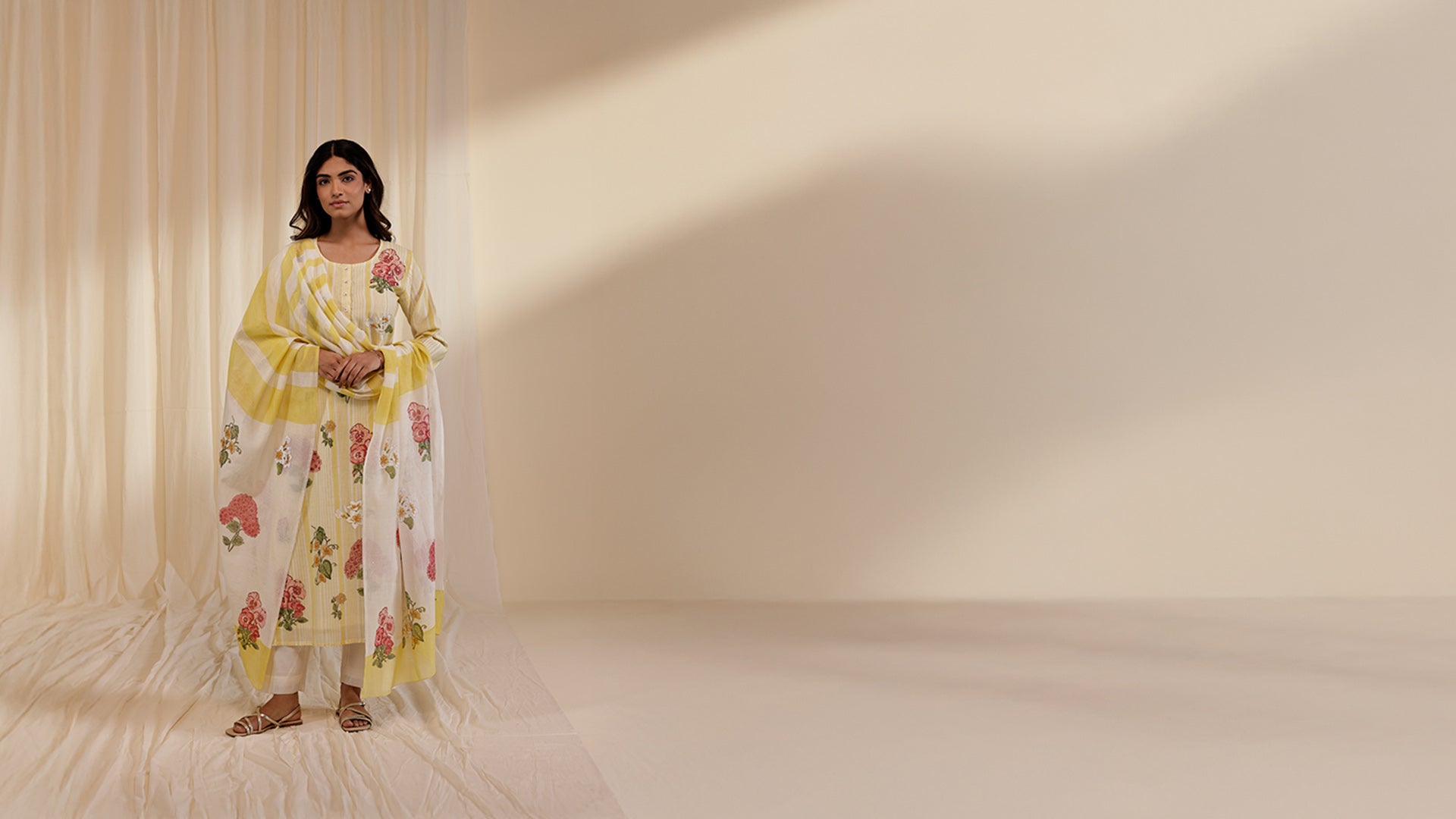 This festive and sophisticated Chanderi dupatta is hand block printed with a striking mix of large floral motifs, each adorned with shimmering silver mukaish work. The florals are alternated with broad bands of stripes, creating a unique and exclusive design that beautifully blends tradition with elegance.