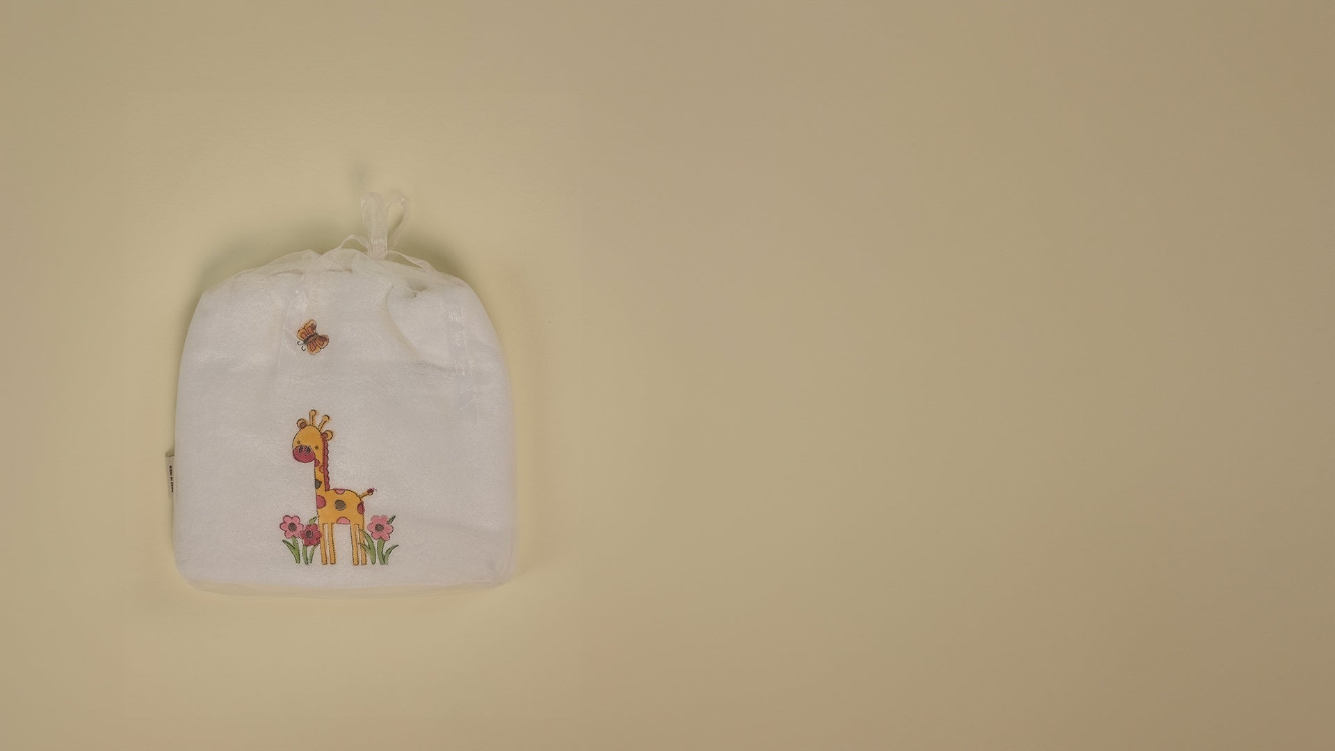 A soft, white towel featuring charming embroidered giraffes among vibrant flowers, accented with fluttering butterflies. This playful design adds a delightful touch to any bathroom setting.