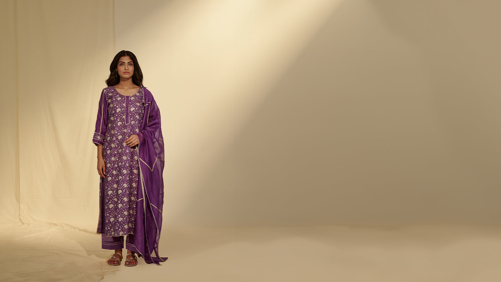 This elegant Chanderi dupatta in a rich purple hue is adorned with striking Gota lace embellishments, adding a touch of shimmer and sophistication. The lightweight and sheer fabric drapes beautifully, making it a versatile accessory to complement various ethnic outfits. Ideal for festive occasions, it brings a luxurious and graceful finish to your ensemble.