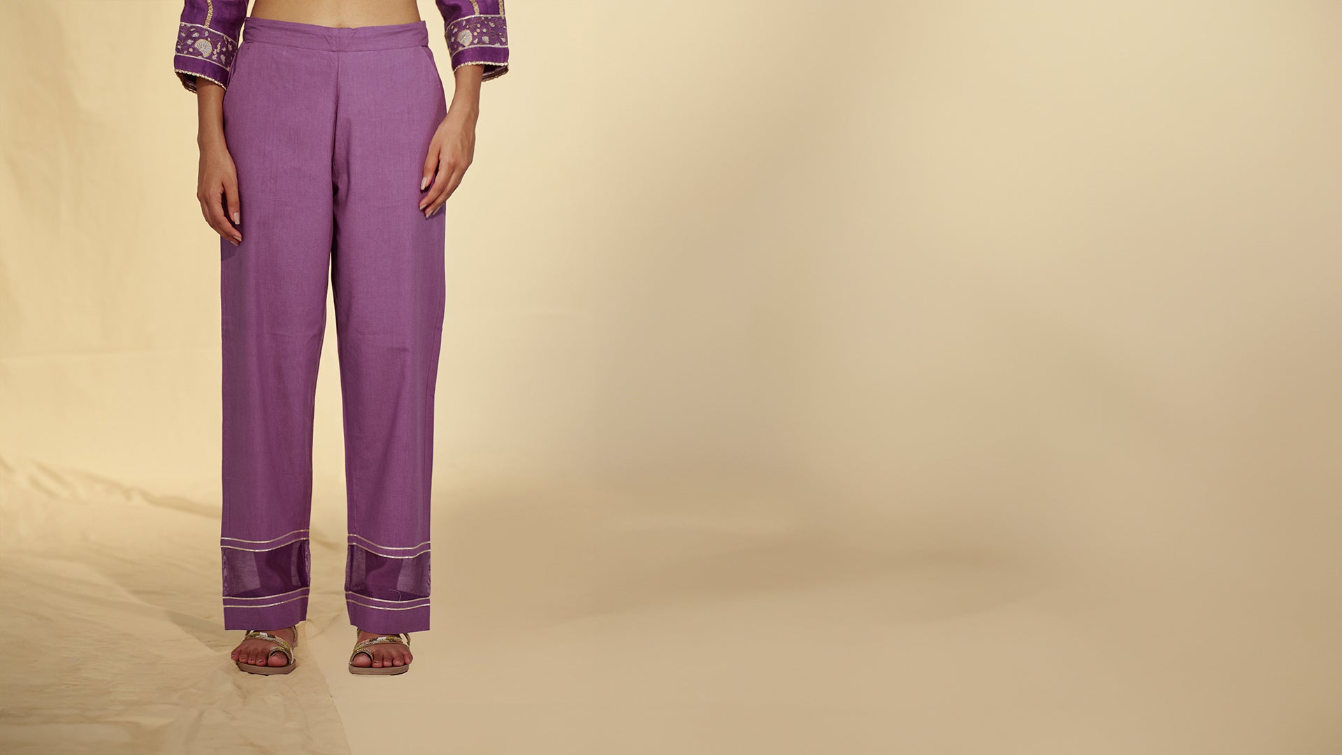 The Goodness Cotton Straight Pant is tailored from breathable cotton, featuring a classic straight cut with an elasticated waistband for a comfortable fit. The pant is detailed with gota lace and chanderi appliques at the hem, adding a subtle touch of elegance. Perfect for pairing with a variety of tops, this versatile piece combines style with comfort.