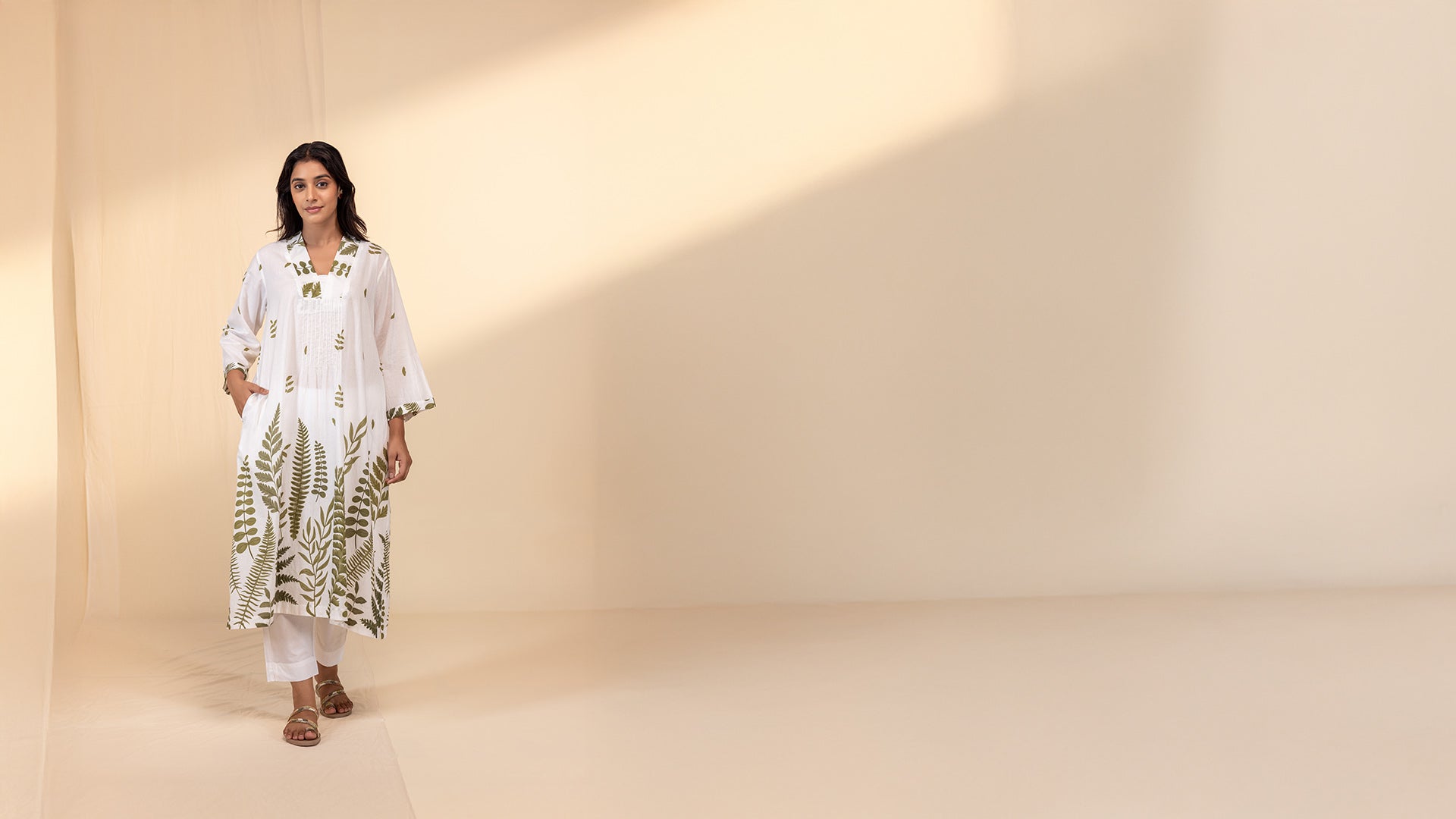 An elegant off-white cotton kurta, artfully adorned with placement prints of varied leafy stems gracefully emerging along the lower flare. The upper half is delicately scattered with tiny sprigs and falling leaves, creating a sense of gentle motion. A broad V neckline is complemented by fine pintuck detailing, while two side pockets add functionality to its relaxed silhouette.