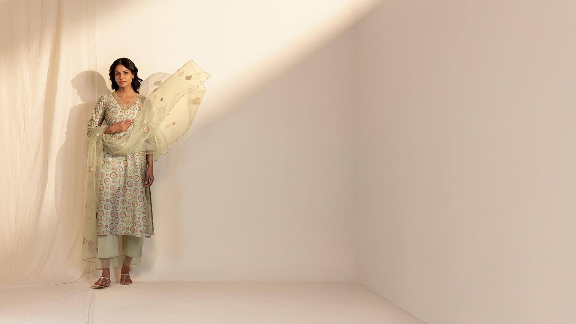 This delicate icy-green net dupatta features handcrafted scalloped edges in golden thread, adding a touch of elegance. Floral appliqués, embellished with golden sequins and intricate machine embroidery, enhance its festive appeal.