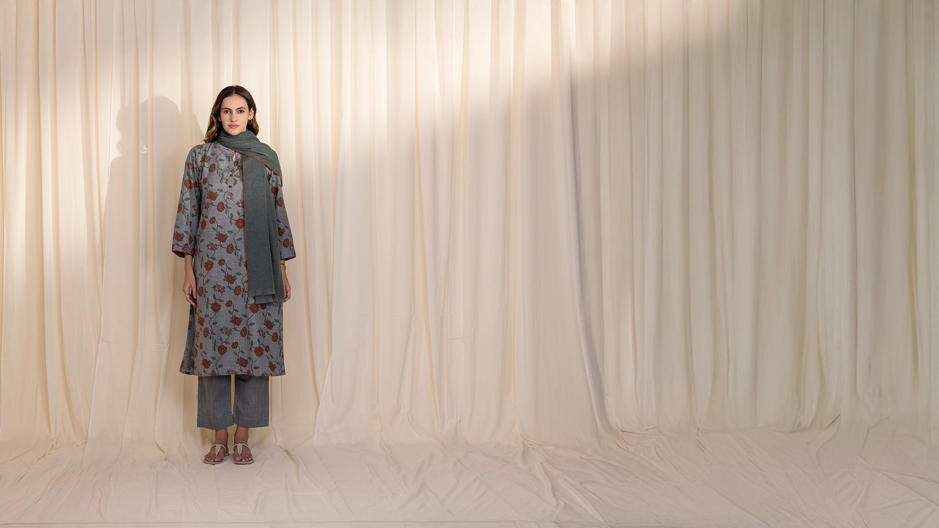 Woven from soft wool, this ash grey kurta features intricate hand block floral prints in sienna, maroon, and dark green on a straight cut silhouette. The mandarin collared neckline has handmade fabric buttons. Maroon piping accents the sleeve cuffs and pocket openigns. Fully lined with voile for comfort and functionality.