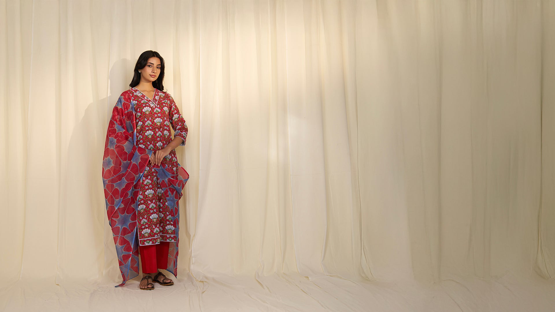 Hand block printed straight cut cotton kurta with vibrant floral print of white, blue, and green on a bright red base. The V-neckline and three-fourth sleeve hems feature pintucks and glass bead details. Blue and white striped piping frames the necklines, sleeve and kurta hems.