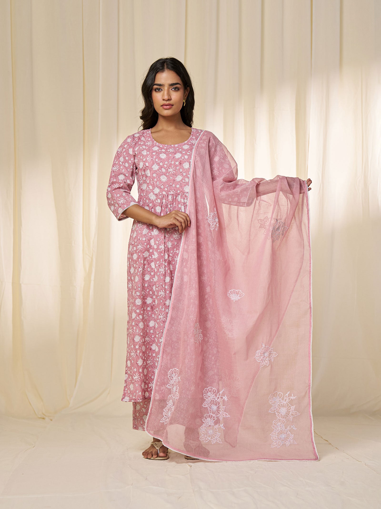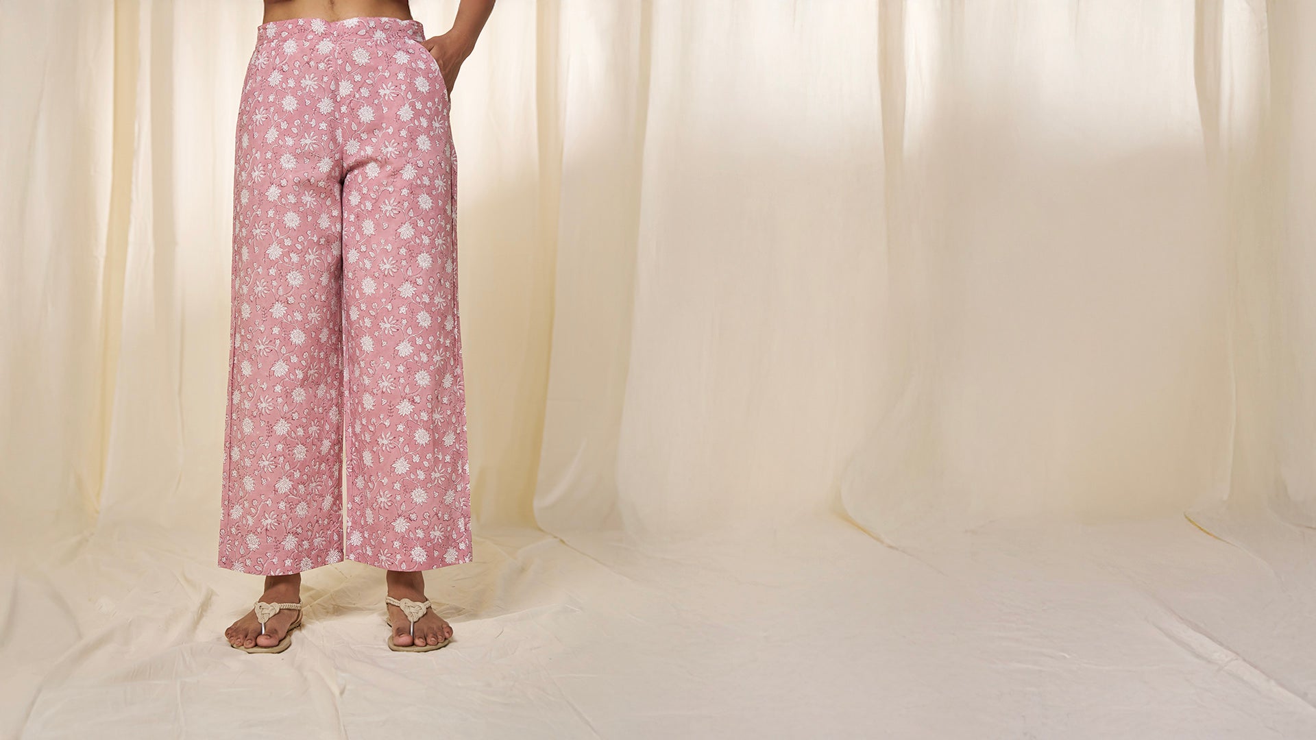 These straight cut dusty rose cotton pants are printed all over with hand block printed small white flower motifs on vines. Featuring two side pockets and a semi-elasticised waist with drawstring for adjustable comfort and style.