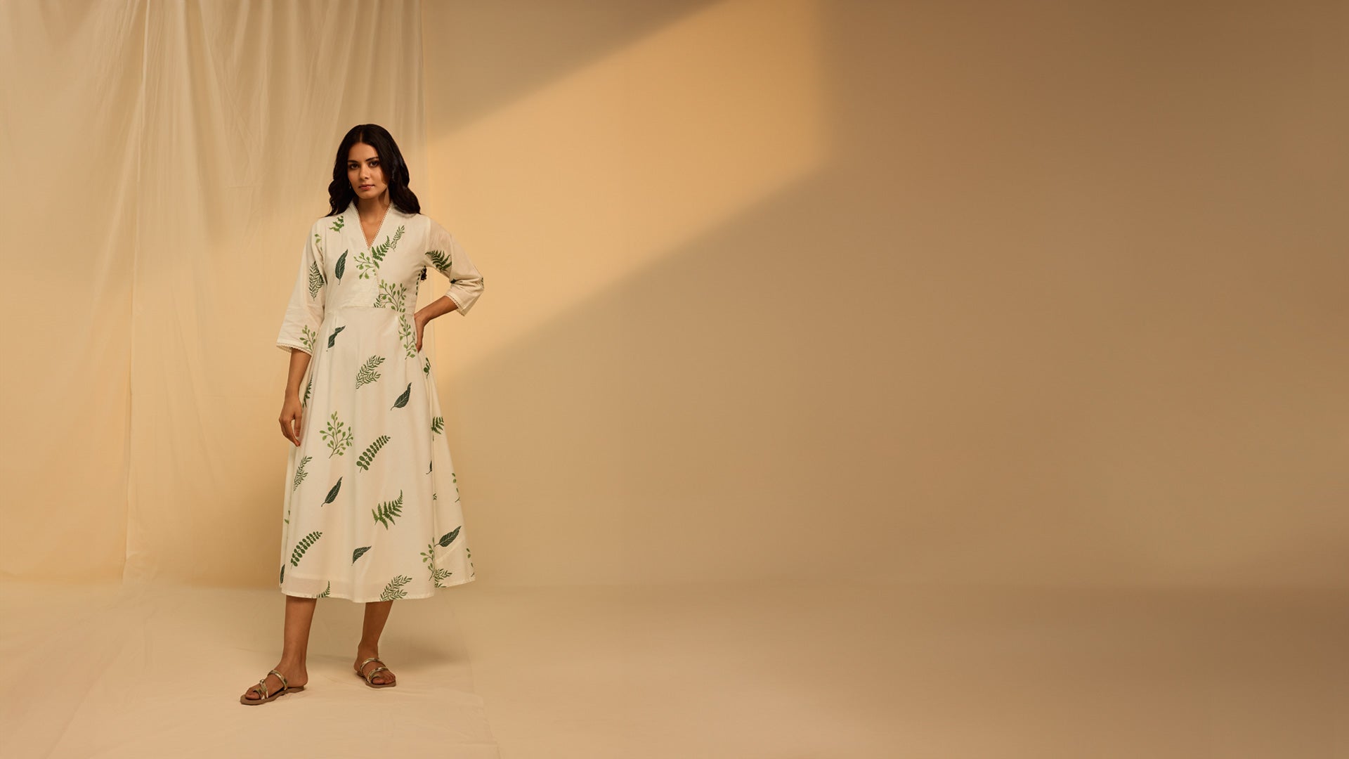 The Hari Pattiya Cotton Dress blends organic elegance with versatile design. Featuring verdant green leaves in a digital print, this fit and flare dress is accented with crocheted lace at the neckline and sleeve cuffs. It includes a soft mulmul lining and can be styled as a dress or an anarkali with matching ecru pants.