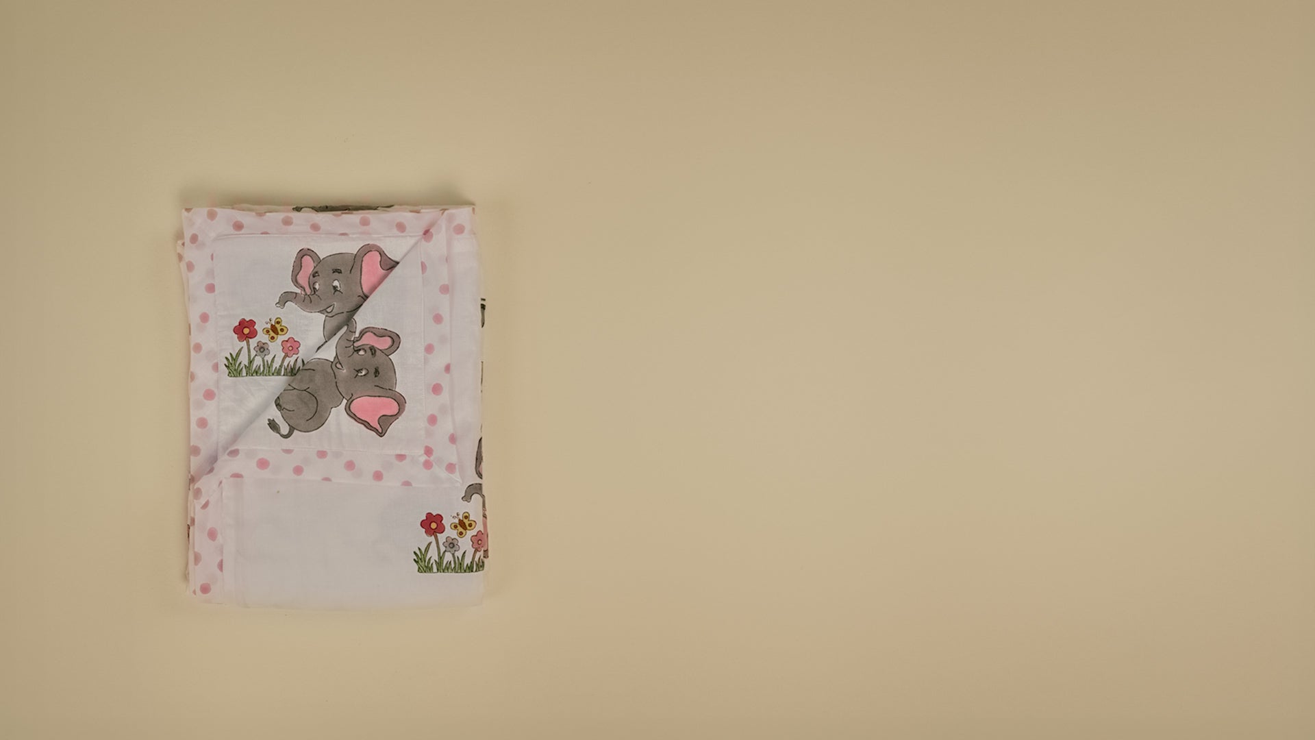 The Hathi Mera Sathi Dohar features cartoon-like hand-block printed elephants, each adorned with charming pink ears, enjoying a garden of flowers and butterflies. Crafted from soft cotton, this dohar is bordered with a polka dot trim, adding a touch of whimsy. Perfect for keeping your little one cozy and comfortable.