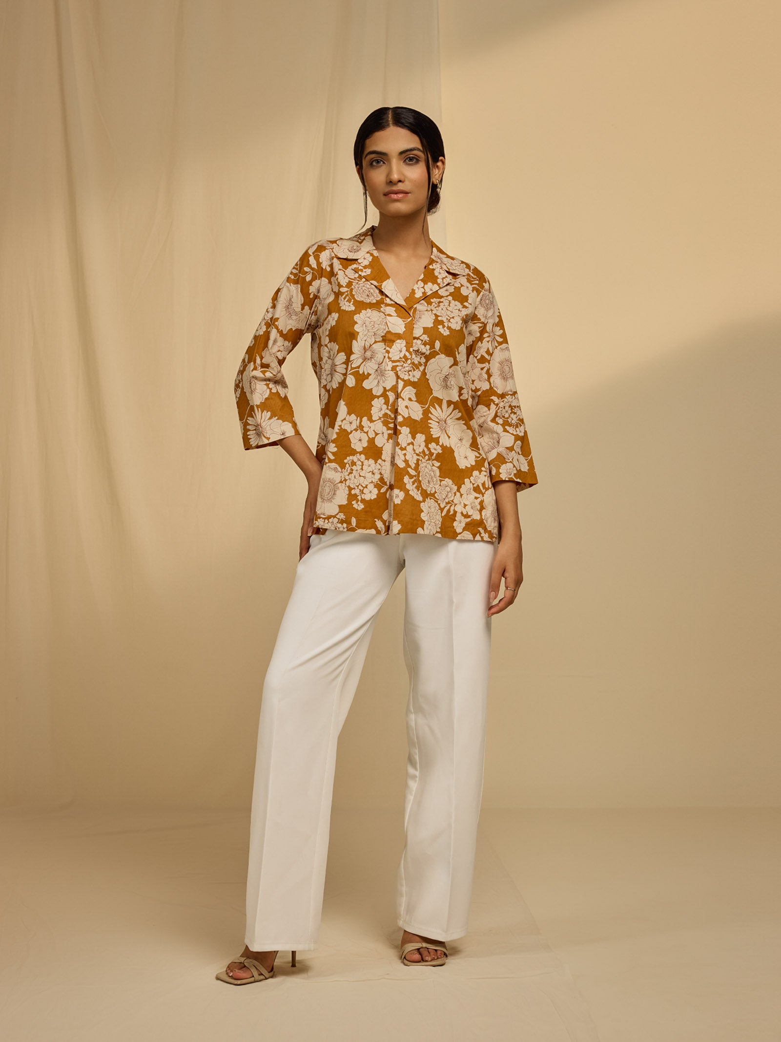This soft and airy pink voile shirt, crafted from mulmul cotton, features a charming hand-printed heart pattern. Embellished with delicate shell buttons, this shirt offers a blend of comfort and style, perfect for casual outings or layering.