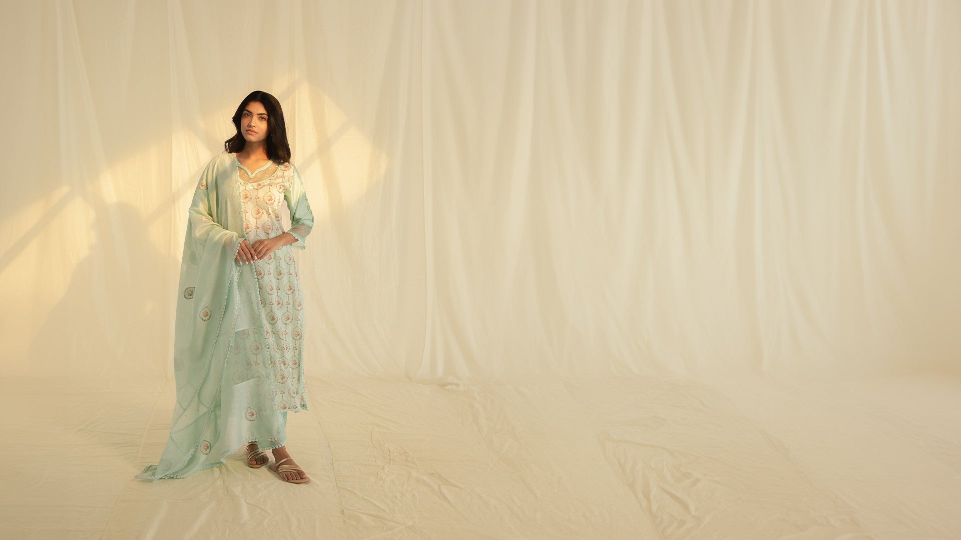 A stunning mint green chanderi dupatta, hand-dyed and adorned with printed appliques and delicate crocheted lace, adding a touch of elegance and charm.