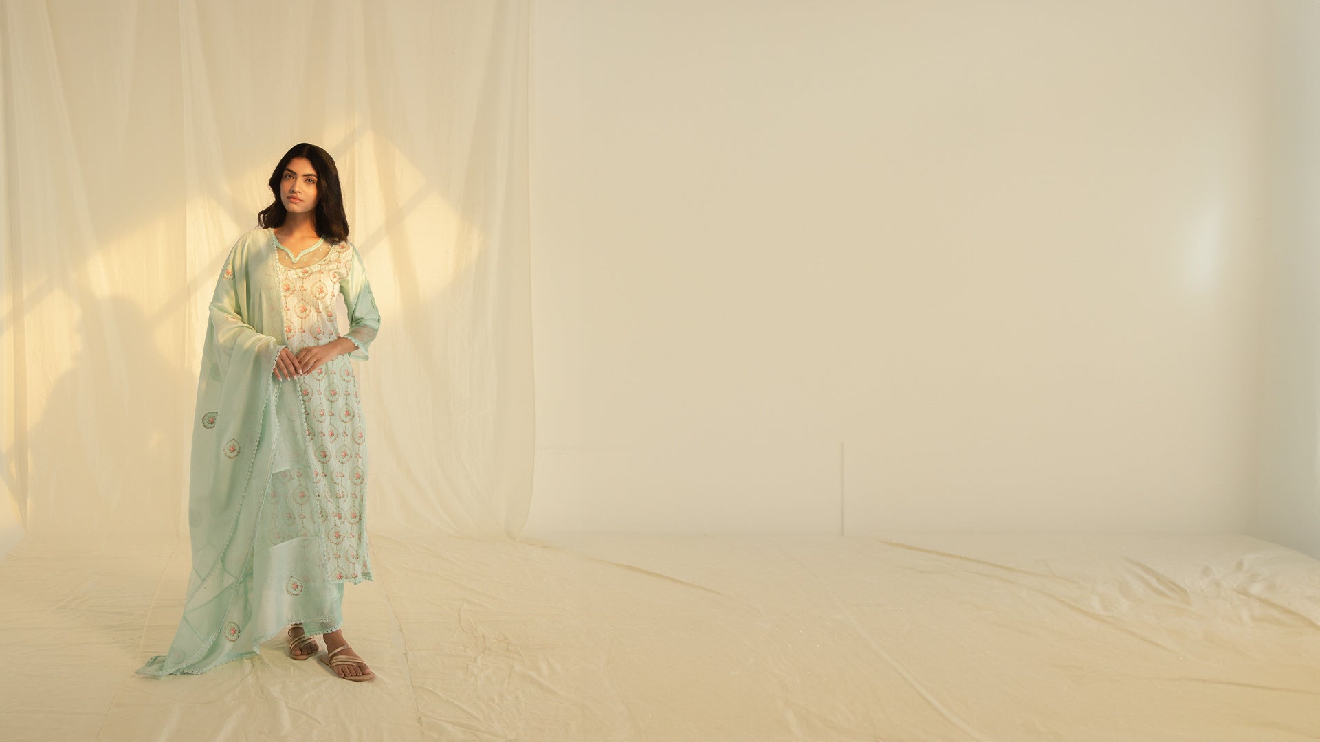 Inspired by Baroque floral symmetry, this High Tea Cotton Kurta features embroidered organza at the neckline and sleeve cuffs. The chanderi sleeves are adorned with crocheted lace, accentuating the modified V-neckline and cuffs.