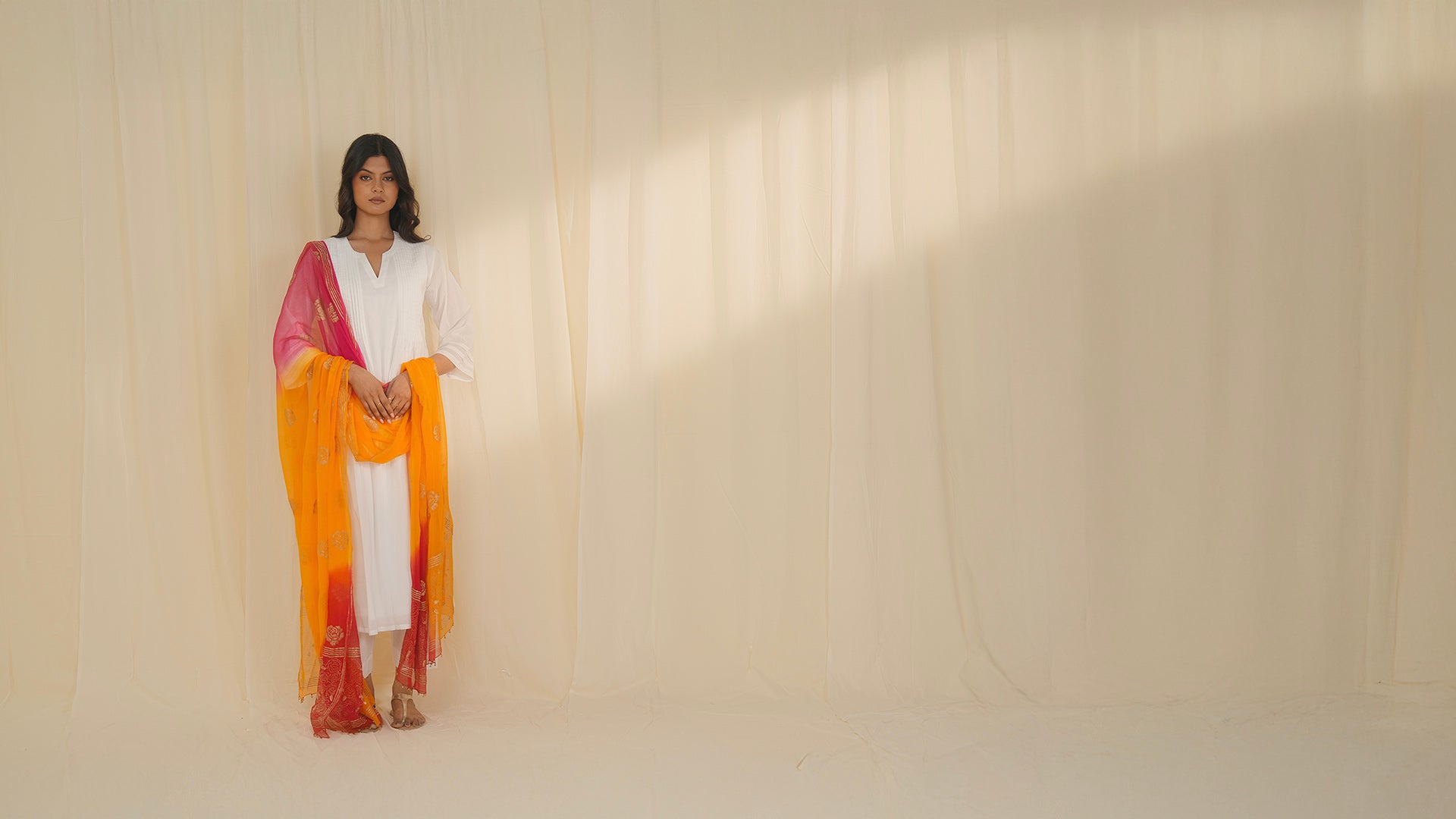 This tie-and-dye viscose chiffon dupatta is dyed in vibrant marigold orange, rose red, and rani pink, offering a rich, festive palette. It is hand block printed in gold khari with an all-over rose motif and a fuller rose design at both ends. The hems feature gold metallic ghungroo bells and glass beads.