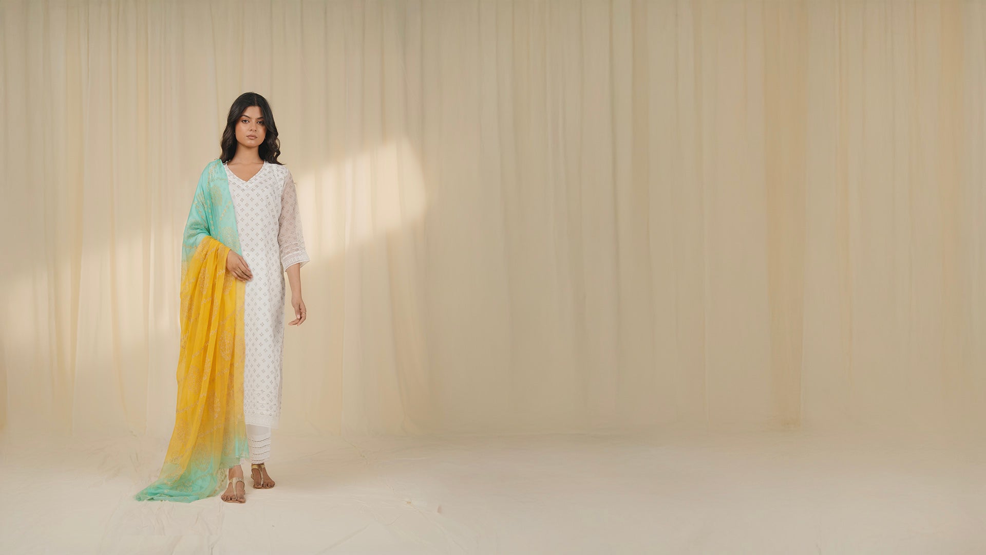 This tie-and-dye viscose chiffon dupatta in hues of light sea green and bright yellow, is hand block printed in gold khari. Featuring Mughal-inspired floral bootas running diagonally and delicate floral stripes. The hems are finished with metallic gold ghungroo bells and beads, for a subtle festive shimmer.