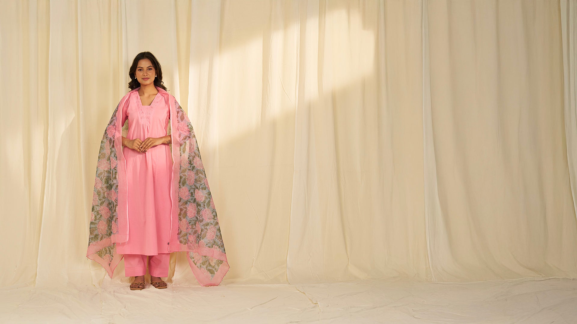 This solid rose-pink cotton kurta is crafted in a panelled fit-and-flare silhouette. It features smocking details on the neckline and 3/4 sleeve hems, adding subtle texture and pattern. Delicate gathers under the yoke enhance the flared shape.