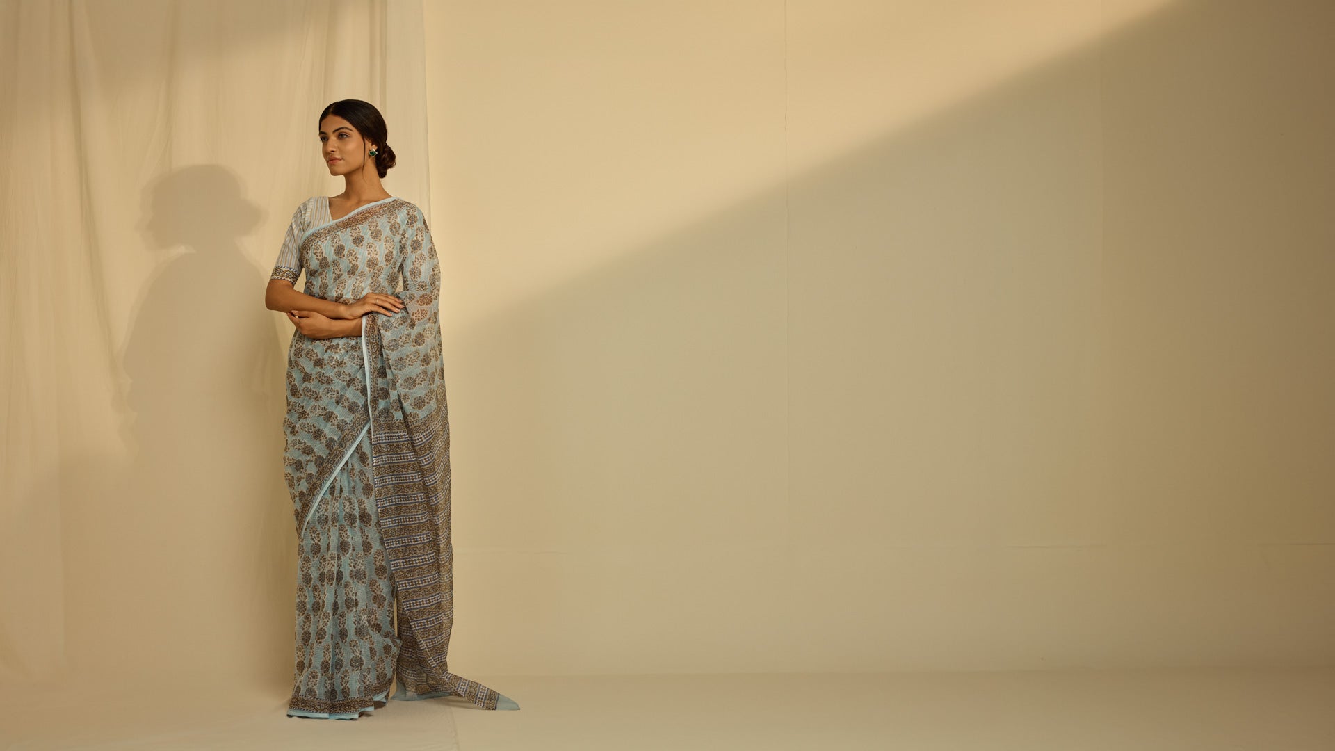The Icy Blue Kota Saree features a delicate floral pattern in muted blue and brown shades, set against a light blue backdrop. The saree is complemented by a striped blouse piece with matching floral accents. Its soft Kota fabric is enhanced with a blue border, creating a cohesive, elegant look perfect for any occasion.