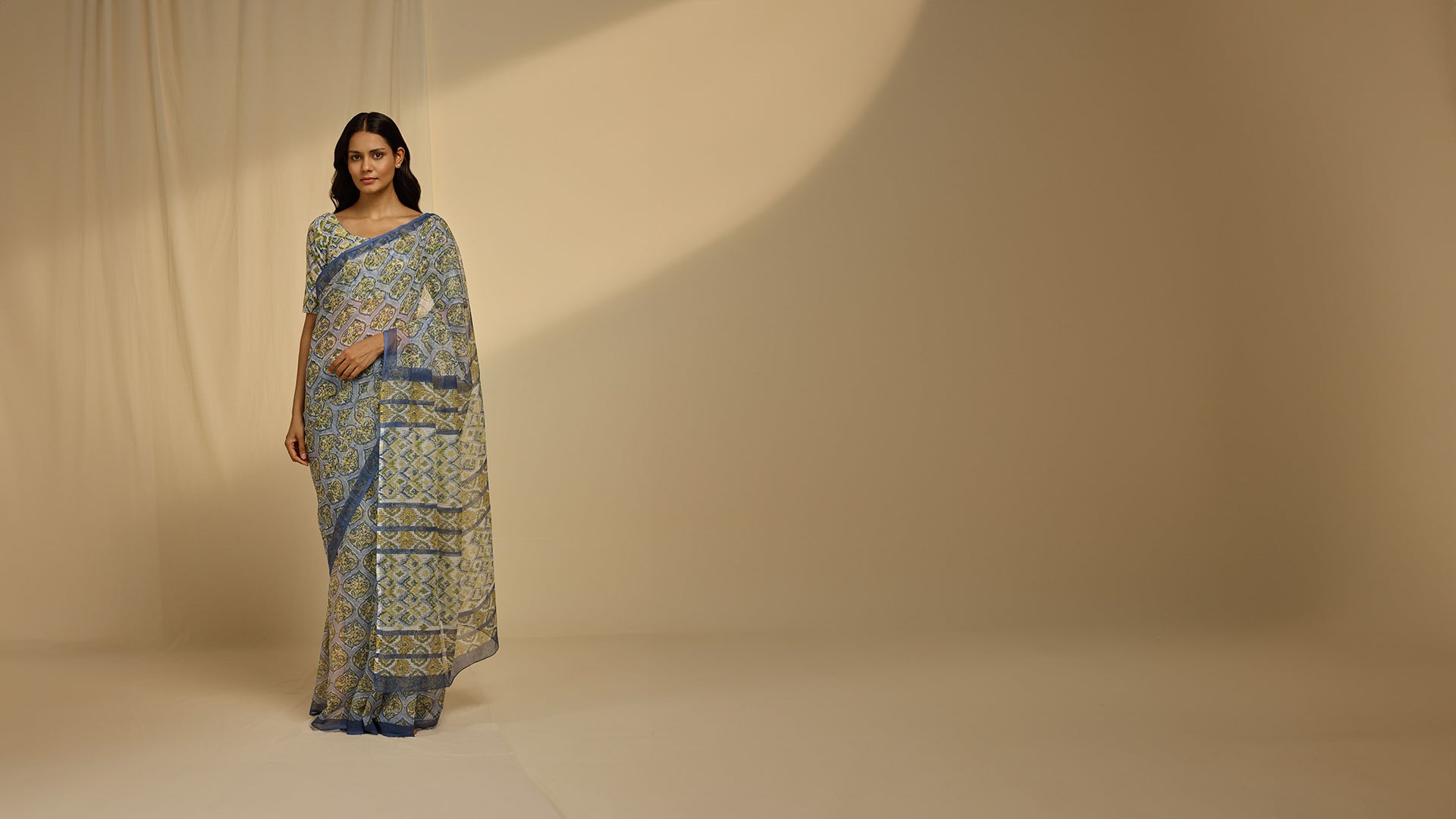 Elevate your style with the Ikat Kota Saree, crafted from lightweight Cotton Kota Doria fabric that drapes beautifully. This saree features intricate hand-block printing, showcasing traditional Ikat patterns. Paired with a matching blouse made from Cotton Dobby, also hand-block printed, this ensemble offers a perfect blend of comfort and elegance, ideal for any occasion.