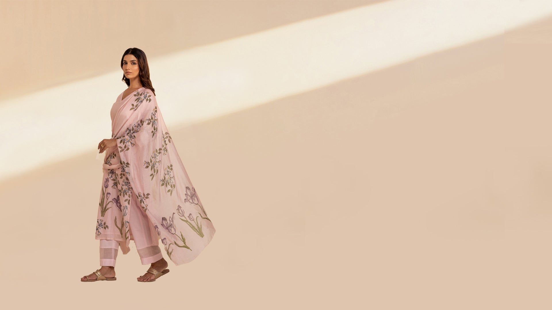 A delicate baby pink Chanderi dupatta, adorned with light blue scalloped lace along the edges, exudes elegance. The hand-block printed floral design, with its soft, watercolor-like strokes, appears as if painted by an artist’s brush. This dupatta is a graceful blend of tradition and artistic charm.