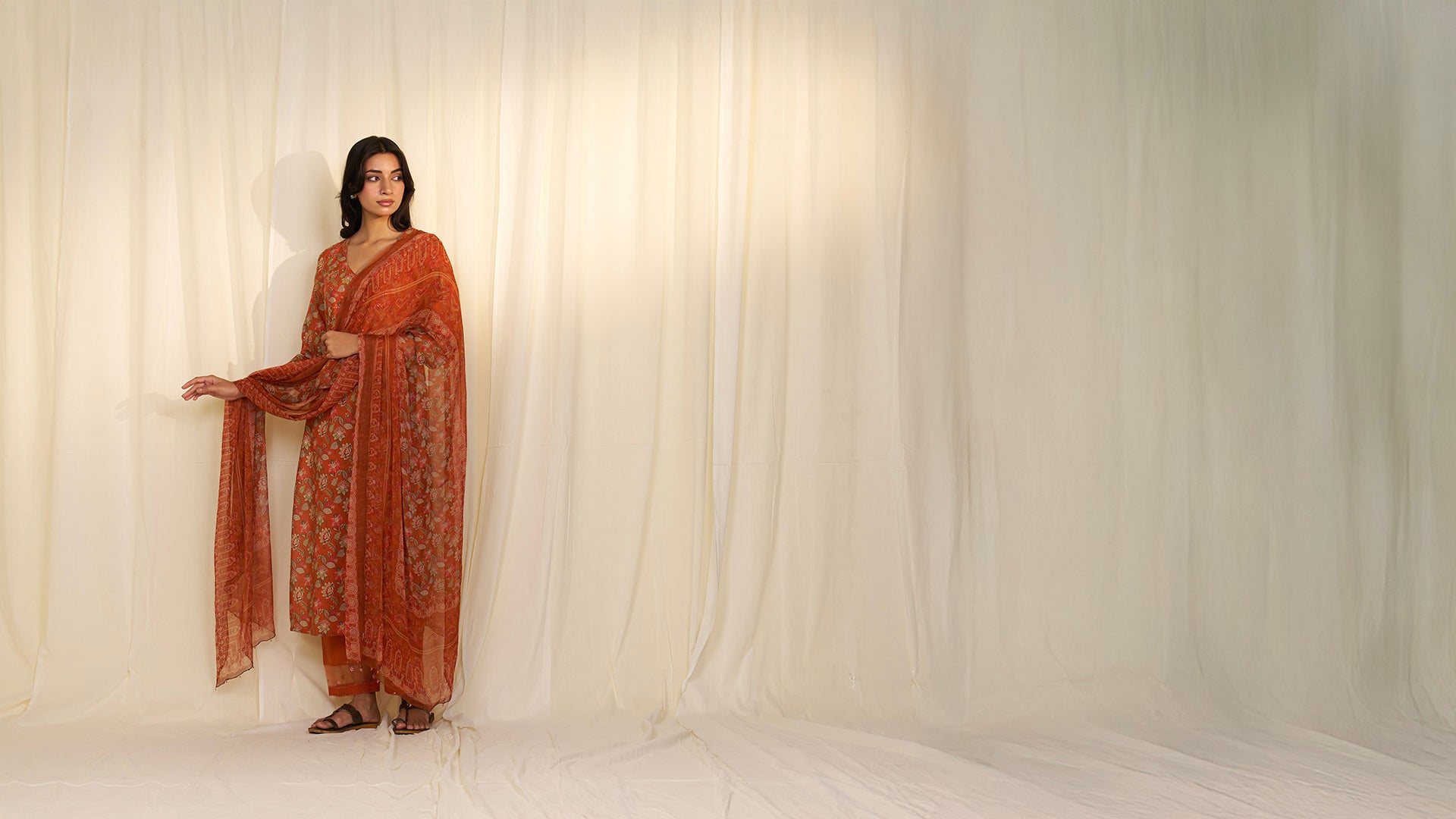 This cotton kurta features a floral chintz print in green, beige, and peach on a rich burnt sienna orange base. The yoke is embellished with red glass beads, silver sequins, and Kantha stitch highlights. The kurta is straight-cut with a V neckline and three-quarter sleeves.