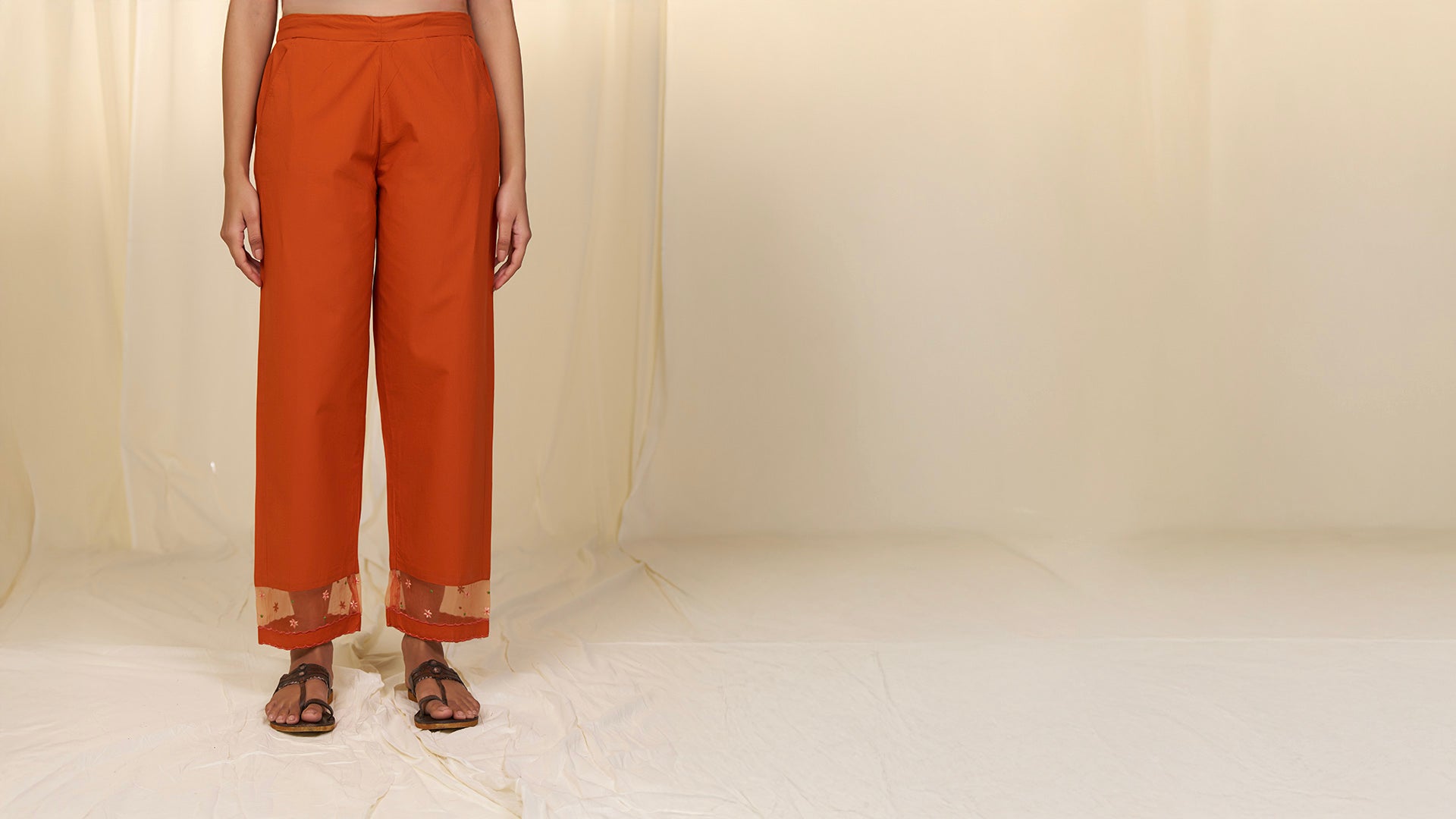 The straight burnt sienna orange cotton pants feature a floral embroidered organza insert near the hem with a delicate scalloped edge. It's designed with two side pockets and a semi-elasticated waistband with drawstring.