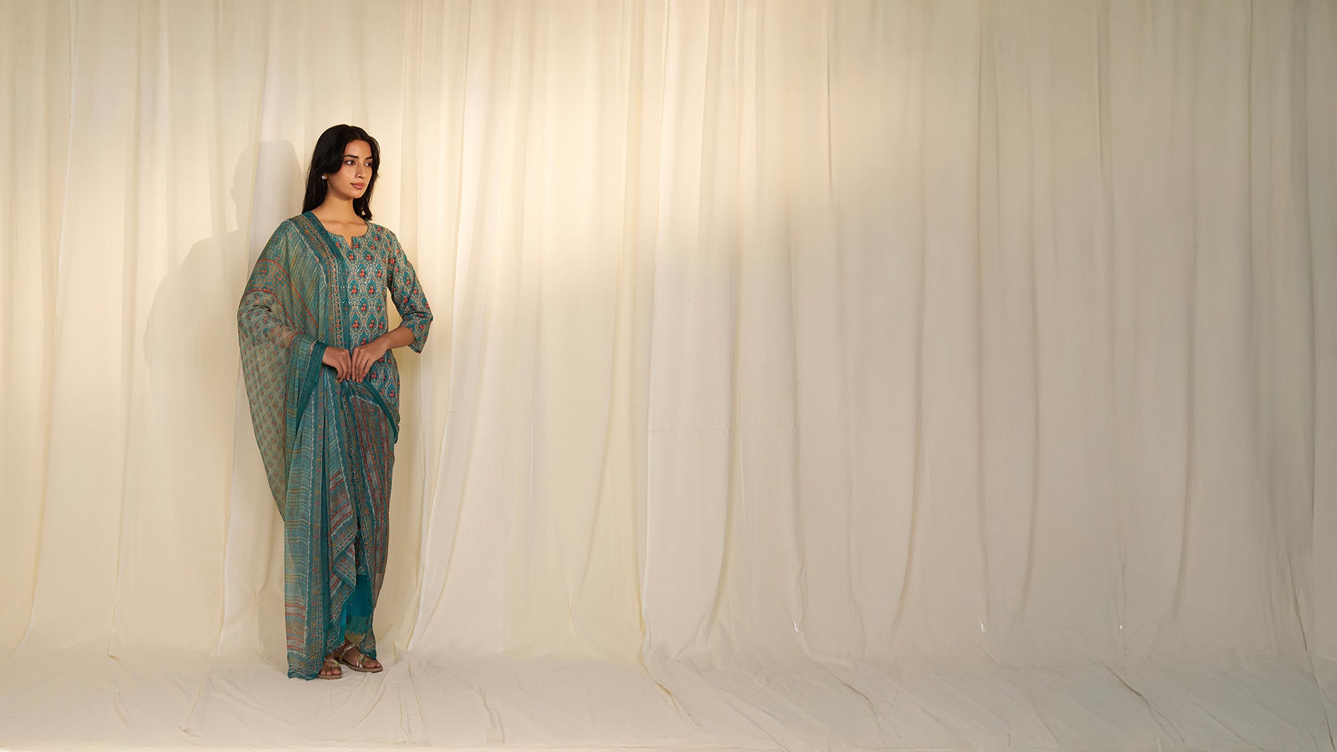 This chiffon dupatta features peach and yellow floral prints on dark teal. Glass beads embellish both ends.
