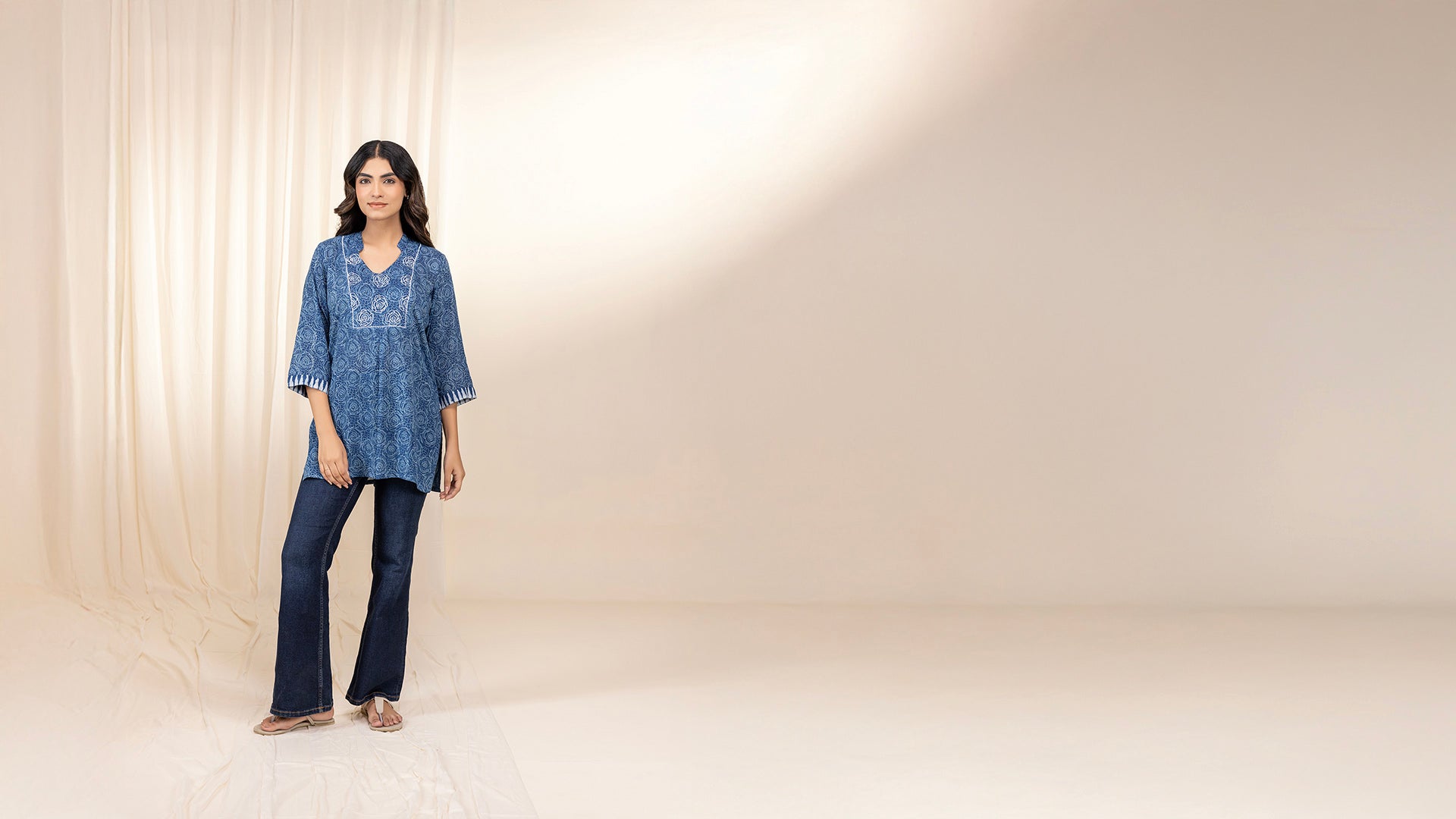 This short tunic is hand block printed in traditional indigo with an all-over rose pattern. It features a mandarin V collar and an inverted box pleat under the yoke. The yoke is subtly accented with embroidered rose outlines. The 3/4 sleeve hems feature a contracting geometric block print. Side splits offer shape and room to move freely.