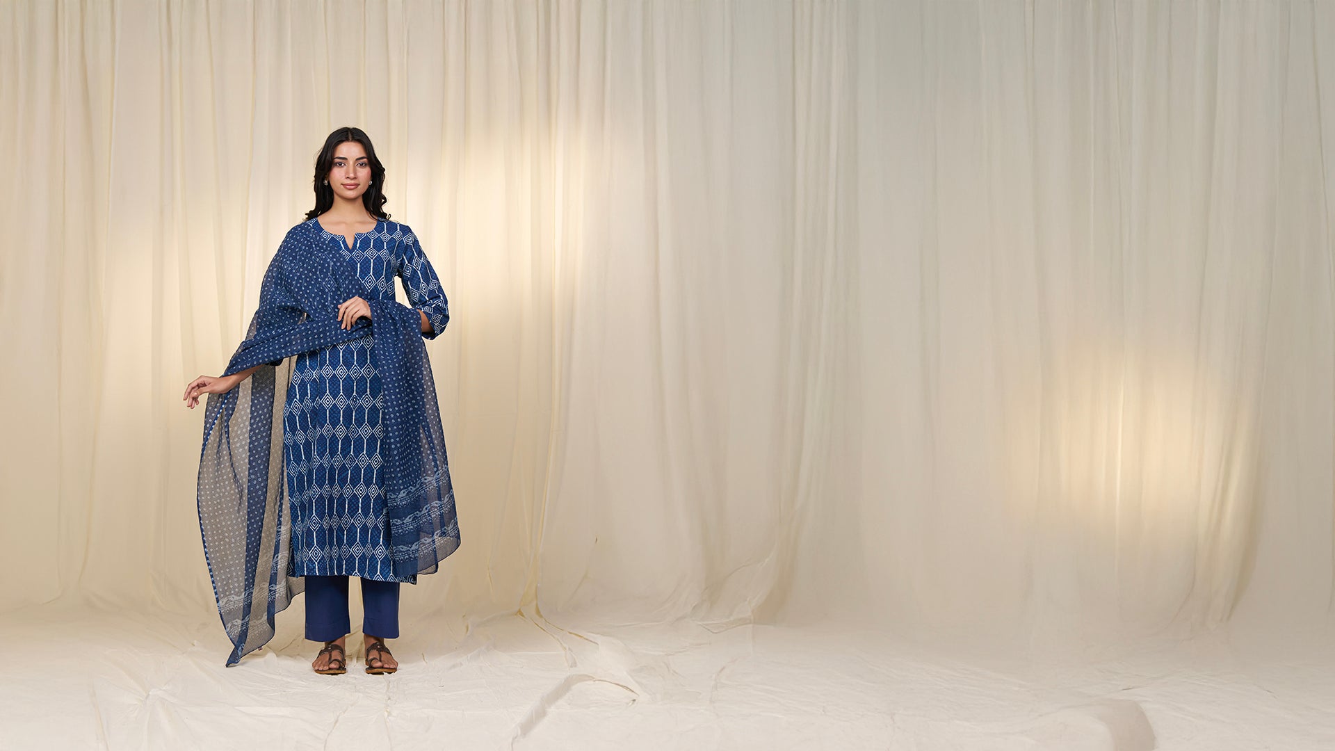 This straight-cut hand block printed cotton twill kurta features an indigo base with white diamond motifs connected by slender lines over a scattered dot base. The design is finished with a split round neckline and three-fourth sleeves for an effortlessly elegant look.