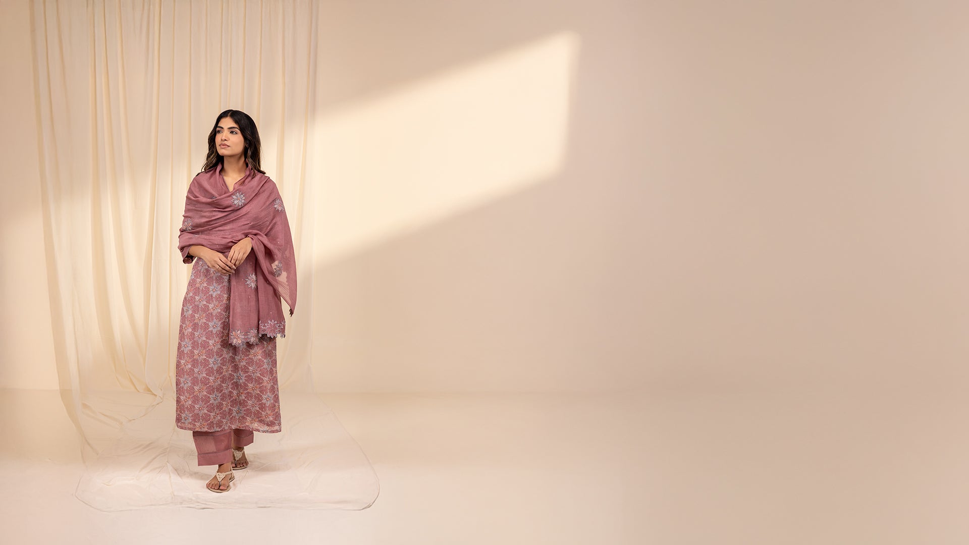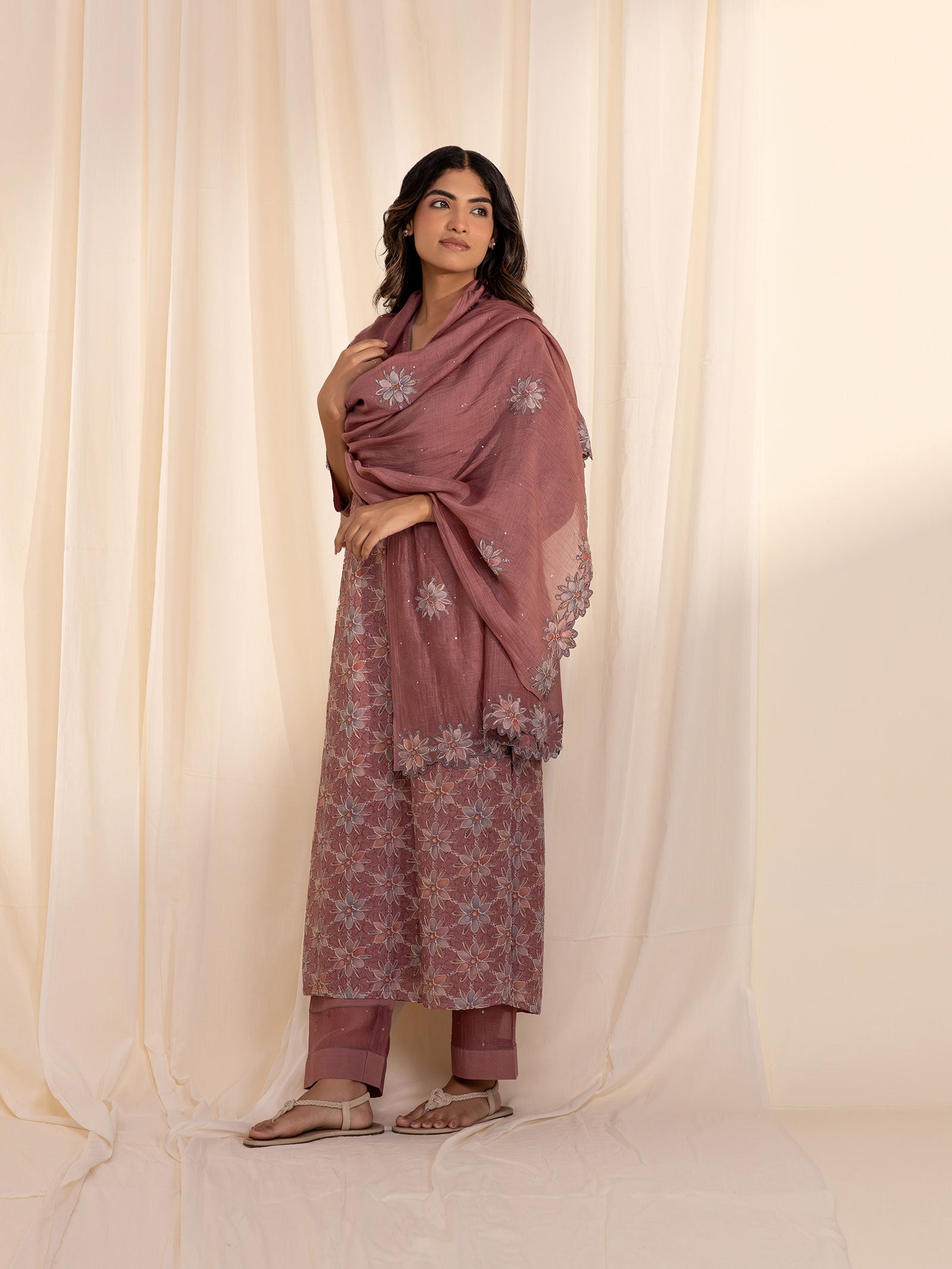 This straight-cut Chanderi kurta features an all-over floral print on a dusty rose base, with blossoms in soft shades of peach, blue, and mauve. Subtly outlined in fine embroidery, the design adds texture and elegance. The neckline and sleeve ends are adorned with tiny sequins and finished with delicate buttonhole stitch detailing for a refined touch. Paired dupatta and pants can be bought separately.