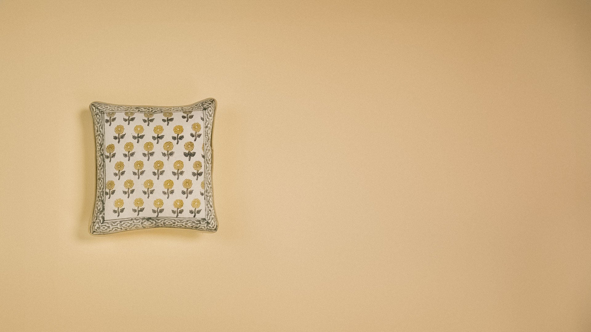 This versatile cushion cover offers a playful dual design. One side highlights a charming floral print with blooming mustard flowers set against a white background, framed by a grey border with intricate detailing. The reverse side complements with soft yellow stripes, creating a fresh, light accent that can blend seamlessly with various decor styles.