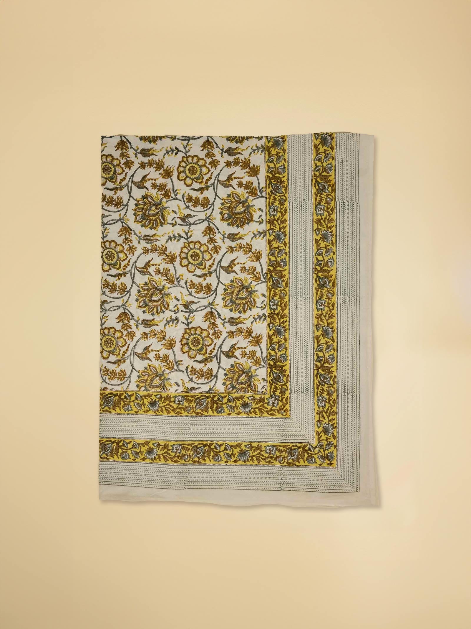The Jodhpur Bed Cover displays a harmonious blend of delicate floral motifs and intricate stripes in a sophisticated palette of yellow, grey, and earthy tones. The bordered design enhances the overall look, offering a luxurious yet understated aesthetic that elevates your bedroom decor with a touch of timeless elegance.
