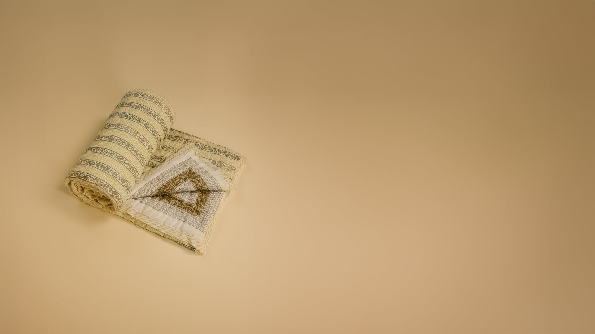 This reversible Jodhpur Quilt showcases two beautiful designs: one side features elegant grey floral patterns with stripes for a sophisticated touch, while the other side displays an intricate motif with floral blocks in earthy tones, surrounded by a geometric border. Crafted from soft cotton, this quilt offers both warmth and style, perfect for elevating your bedroom decor.