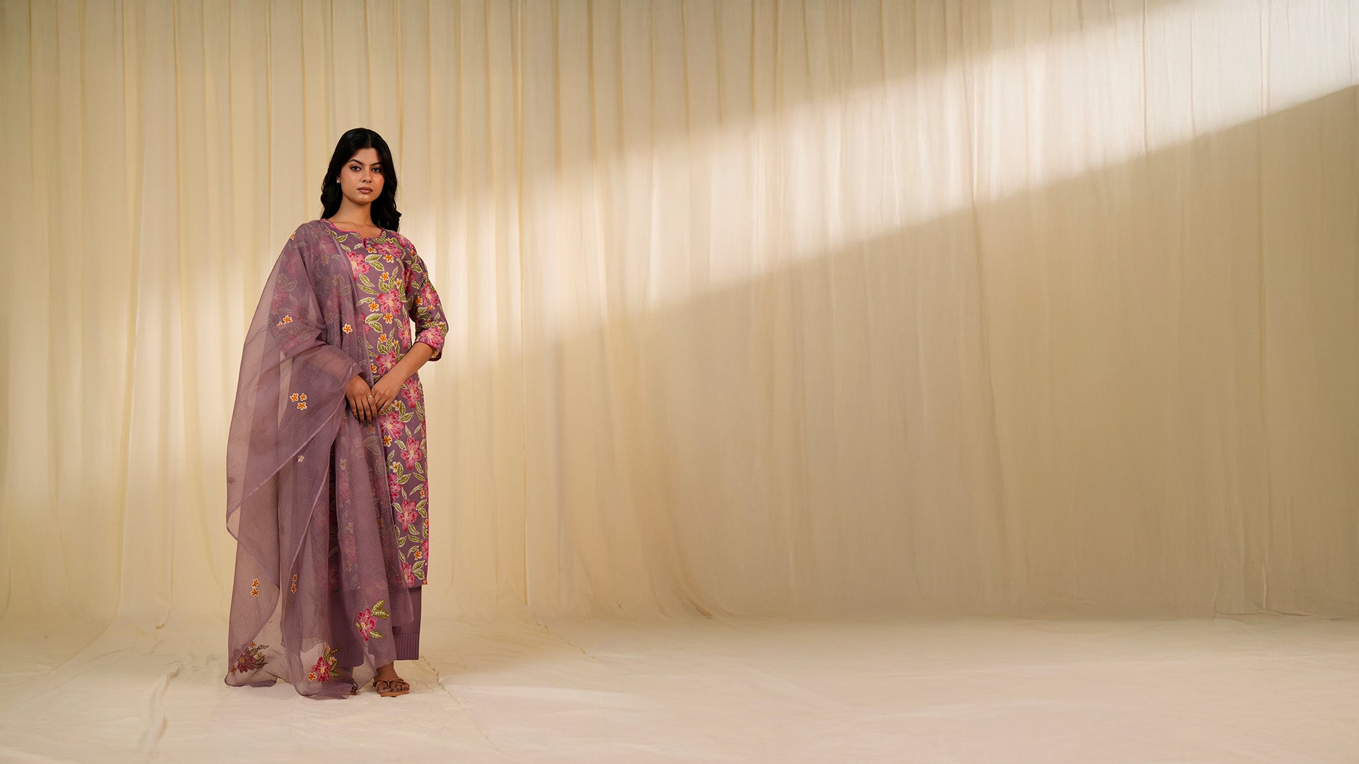 This mauve taupe Kota Doria dupatta is accented with large pink floral appliqués on both ends, while the main body has scattered small yellow flower appliques. These vibrant motifs create a striking contrast against the muted purple base.