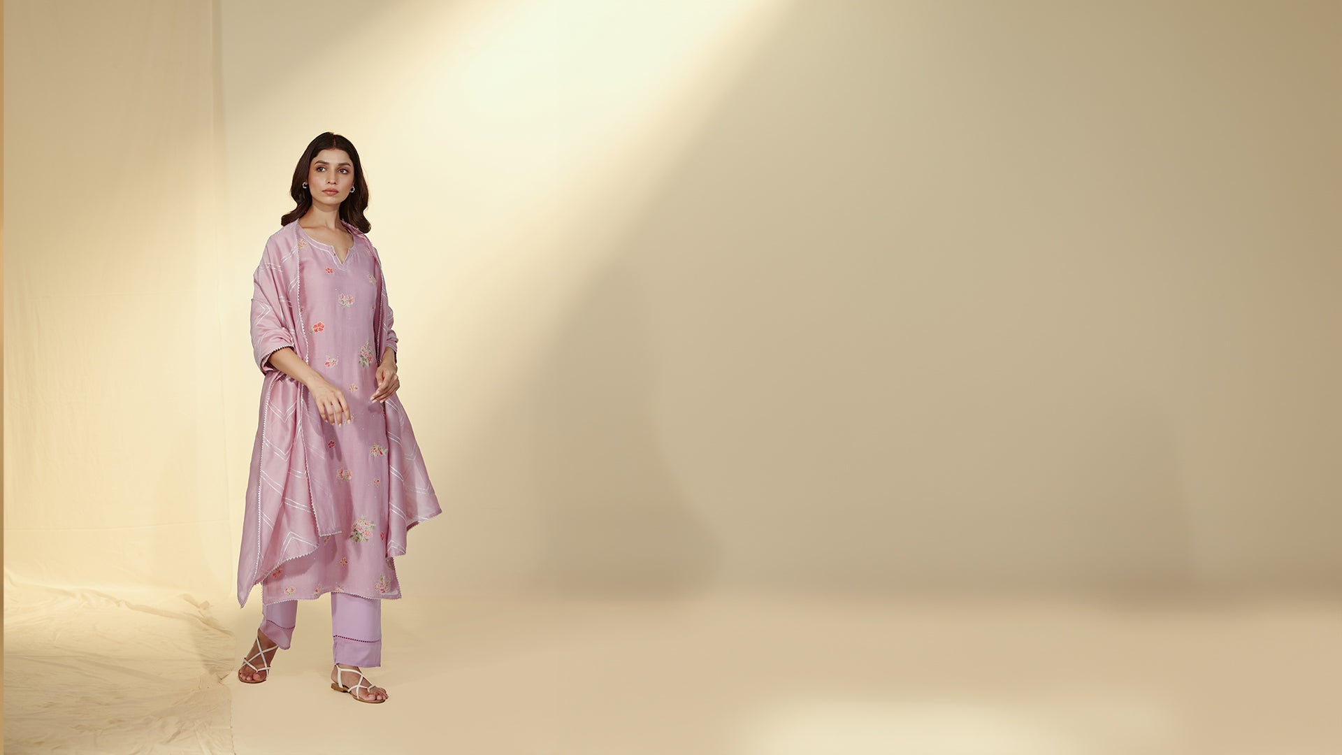 Crafted from delicate Chanderi fabric, the Just Mauve Dupatta is adorned with elegant gota lace in a bold lines that add a subtle shimmer. The dupatta is bordered by an intricate gota lace.