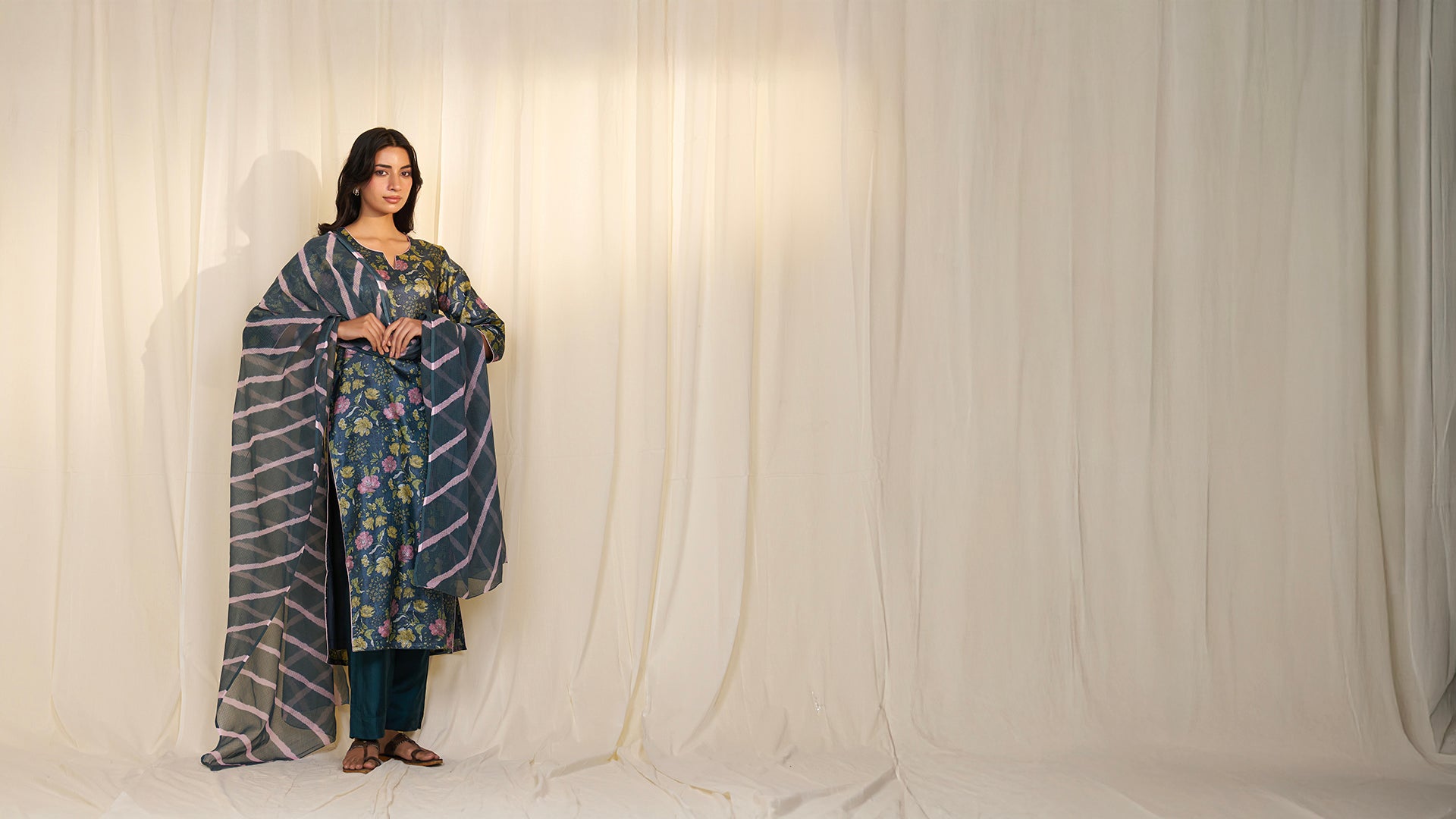 This hand-block printed tussar silk kurta has an all-over floral print on a deep slate-blue base, showcasing blooming flowers in soft blush pink and muted yellow alongside olive green foliage. It's straight cut design includes a split round neckline and three-quarter sleeves. Baby pink piping trims all seams and the kurta is lined with voile for comfort.