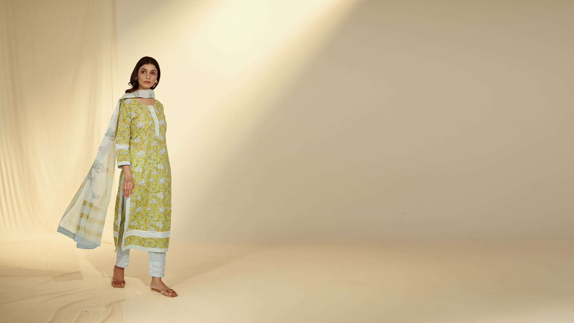 Hand-Block Printed kota doria dupatta featuring aqua flowers blossoming on a lemon base, is a vivid representation of the freshness and vibrancy of sunny afternoon. This design captures the essence of warm light and rejuvenating energy of a bright sunlight day, creating a garment that is both uplifting and visually striking. It is edged with fabric trims and lace.
