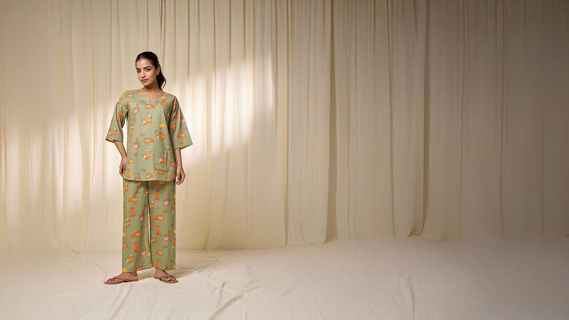 The olive green night suit set features a print of playful kittens engaged in various daily activities. The top has a split round neckline, rounded hem and a functional front pocket, complemented by three-quarter sleeves. It comes with matching pajama pants that include two side pockets and a semi-elasticised waistband with drawstring. The set also includes a small pillow with appliques and a matching scrunchie for a coordinated look.