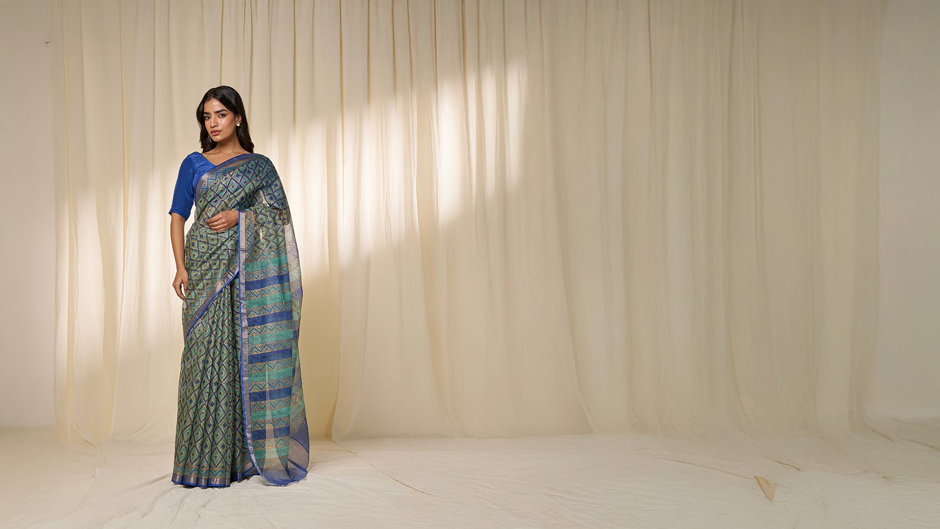 This hand block-printed Kota silk saree features a geometric diamond patterns in dark blue, gold, and turquoise green. It has a woven gold border, while the pallu carries chevron and stripe prints. This saree includes an attached, single-coloured blouse piece in a matching blue.